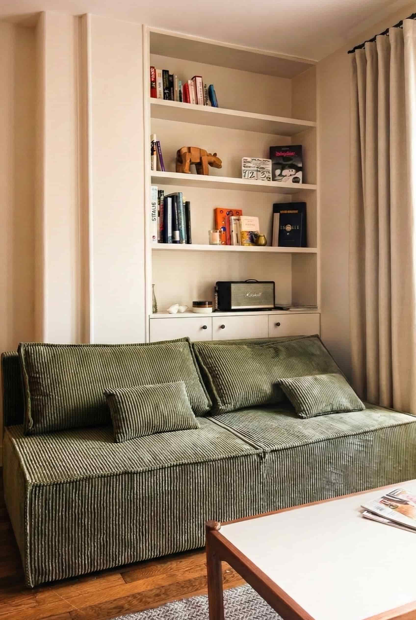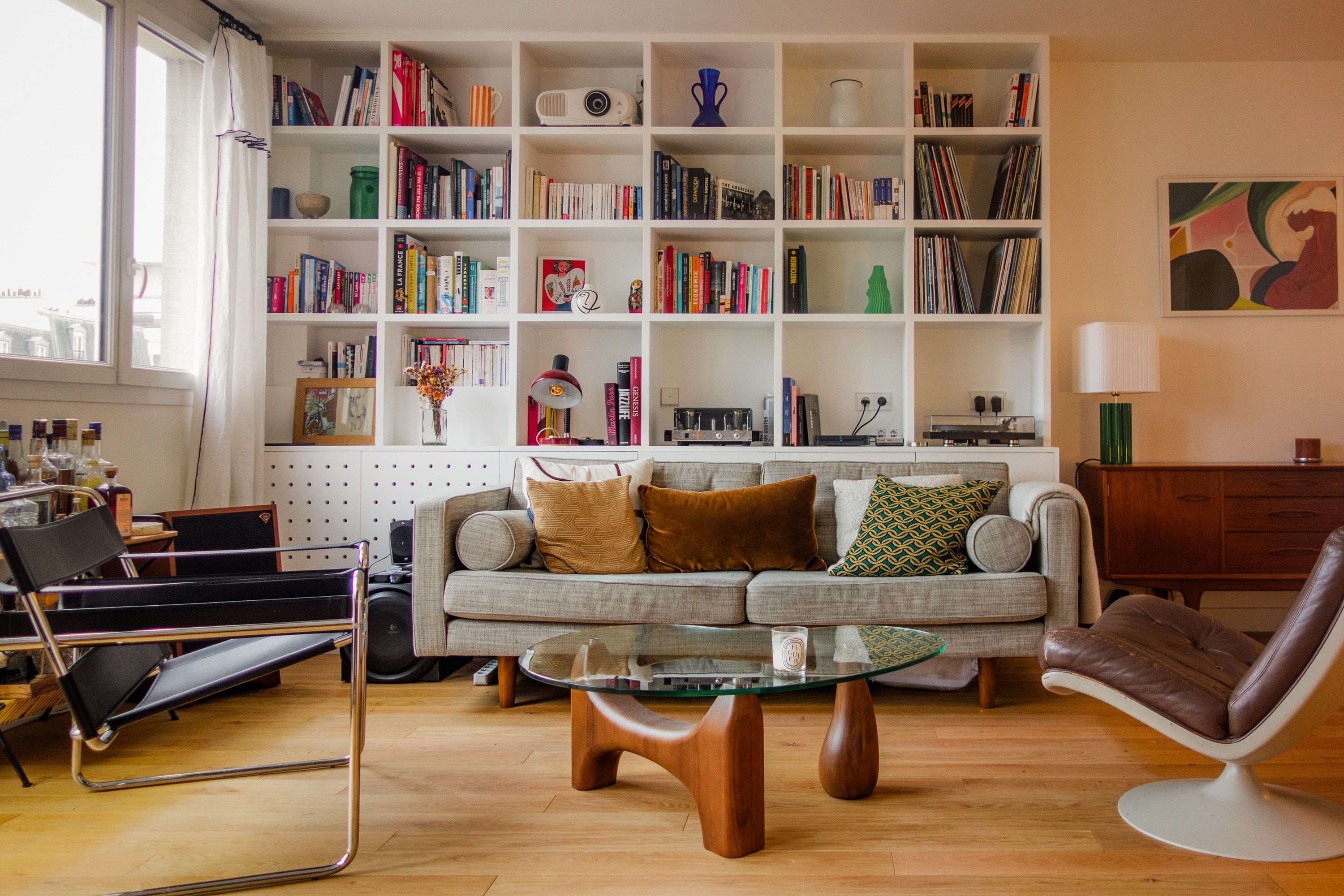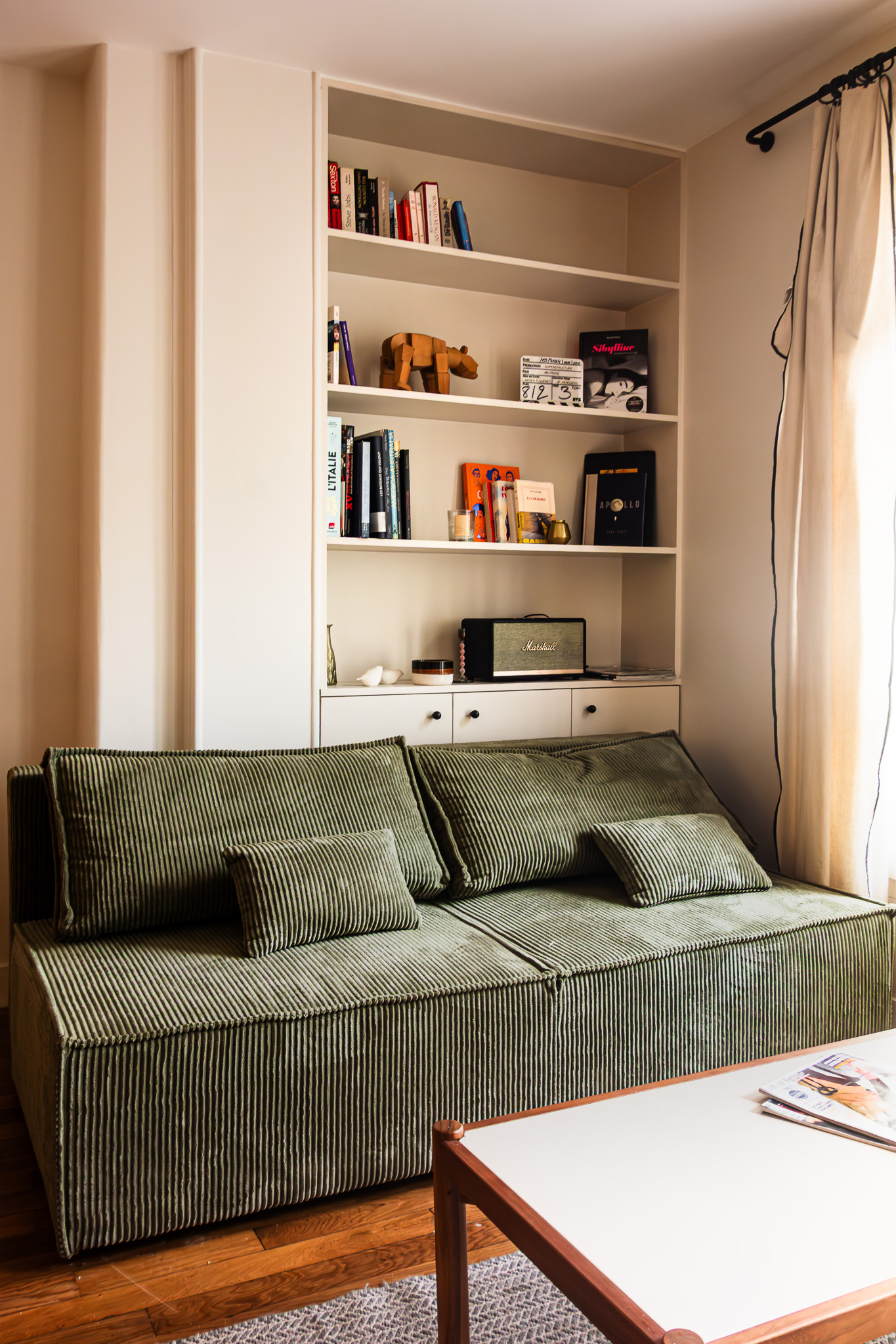 Appartement de 65 m² dans le 19e. Restructuration complète, cuisine déplacée en pièce de vie, salle de bain japonaise avec baignoire encastrée, bibliothèque salon.