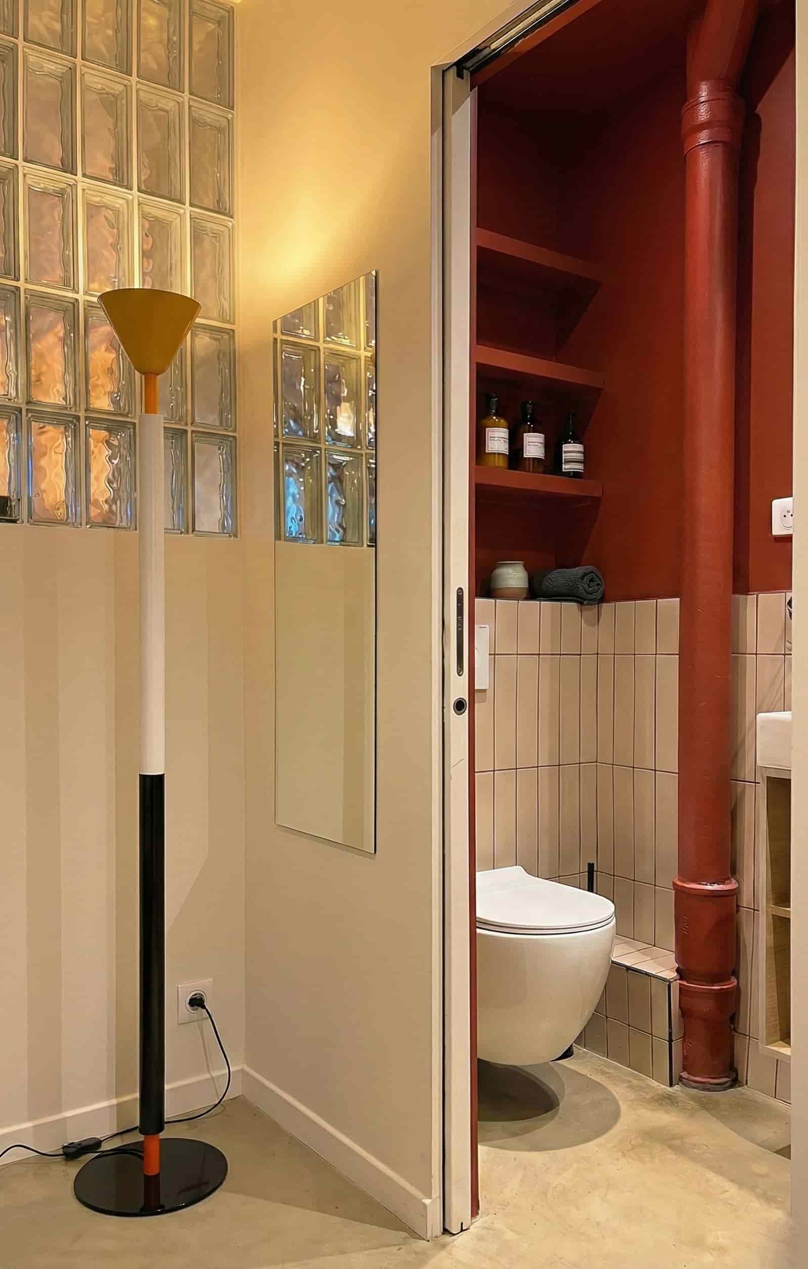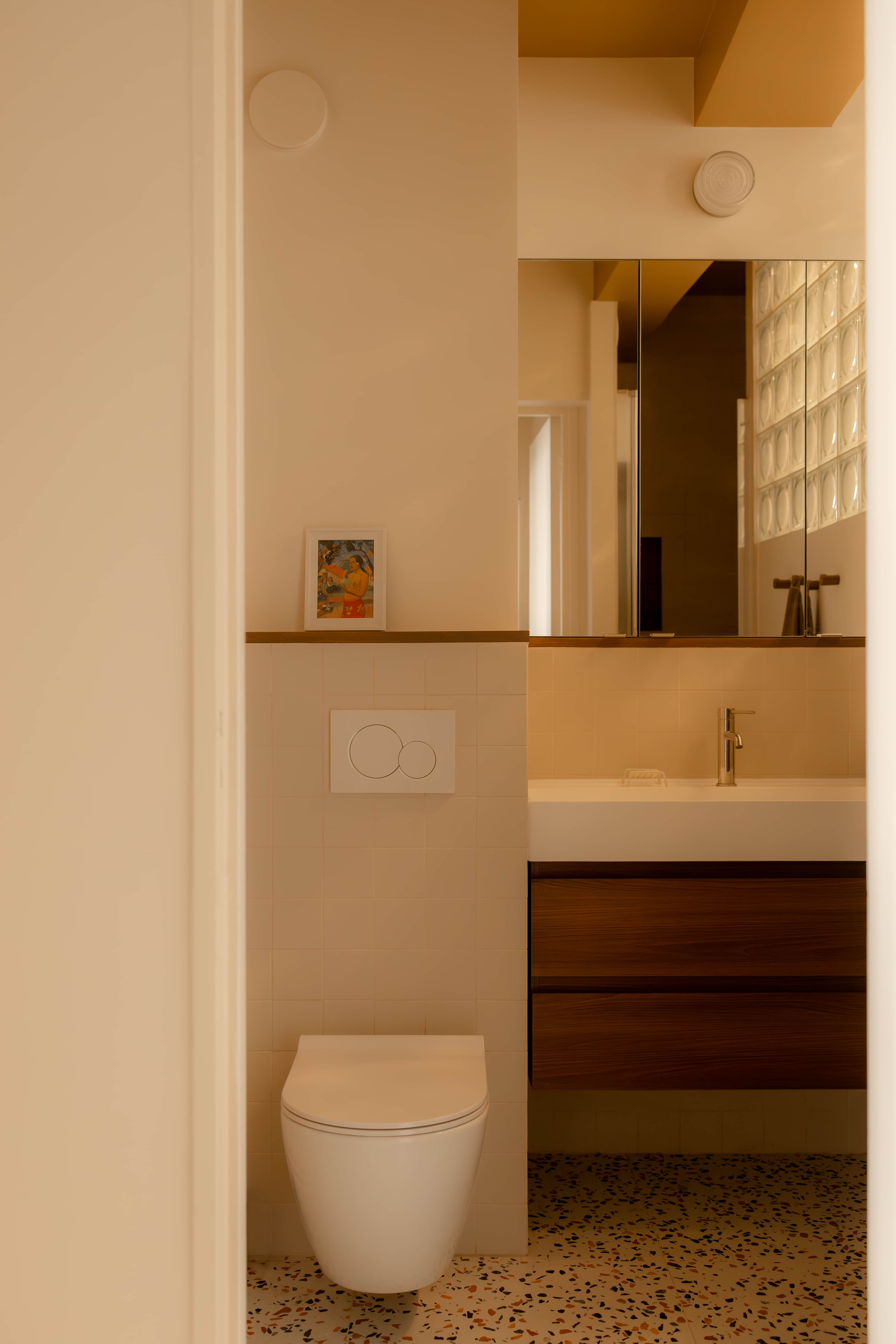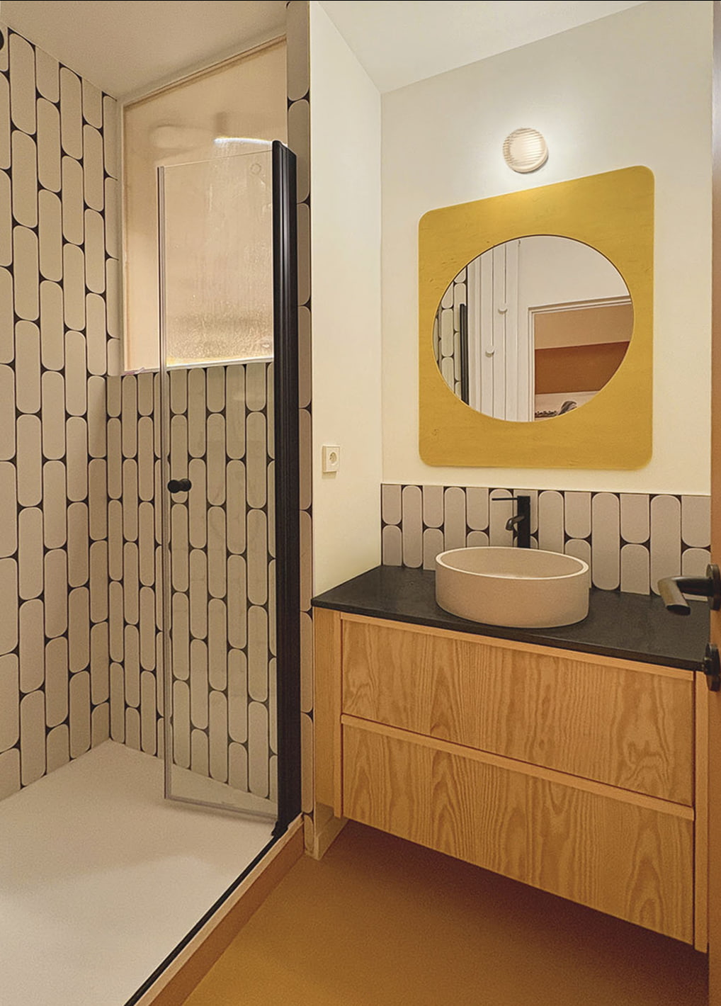 La distribution a été entièrement repensée selon une logique japonaise de compacité maîtrisée : douche à l'italienne, WC suspendu, lavabo. Chaque centimètre assumé.