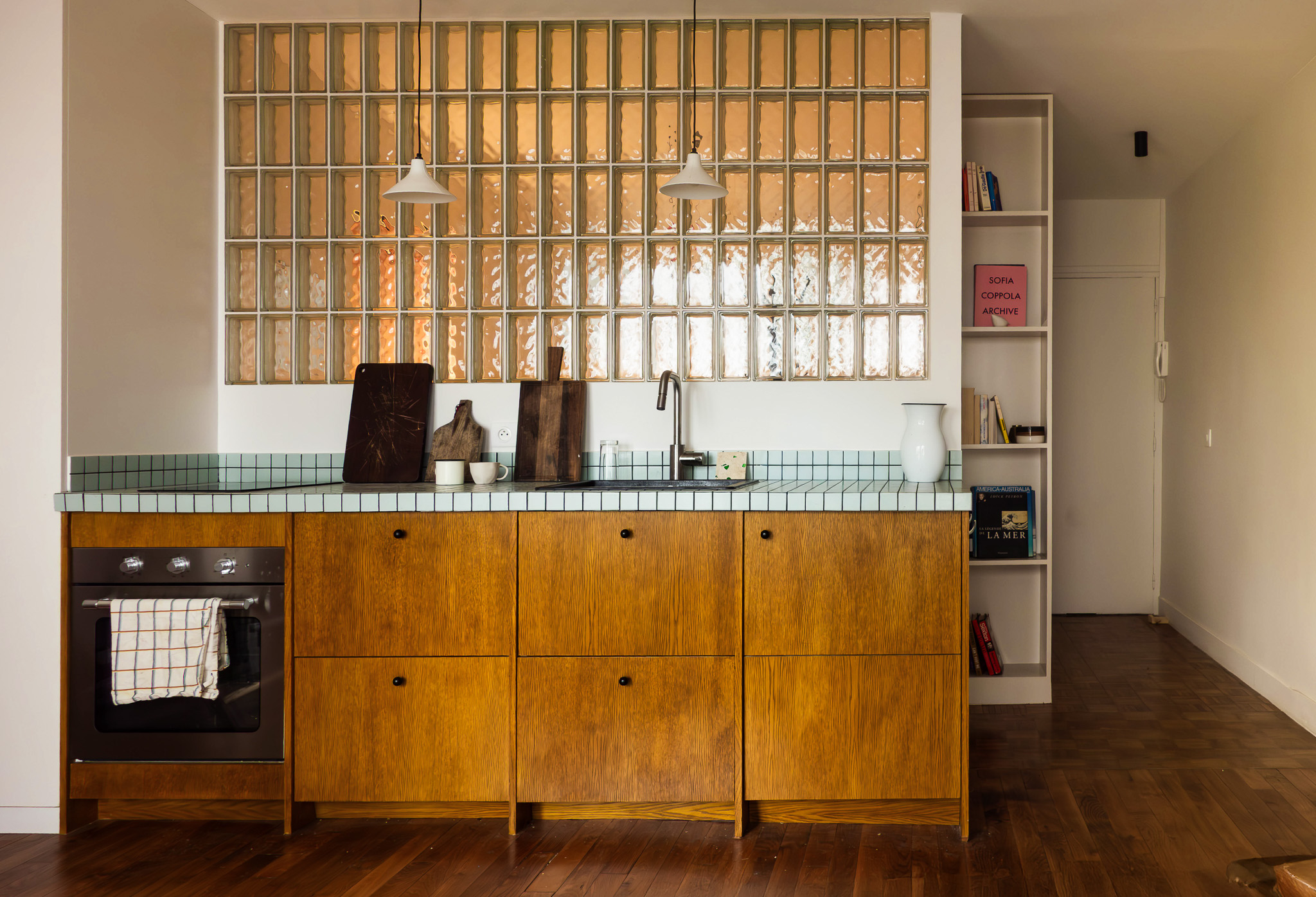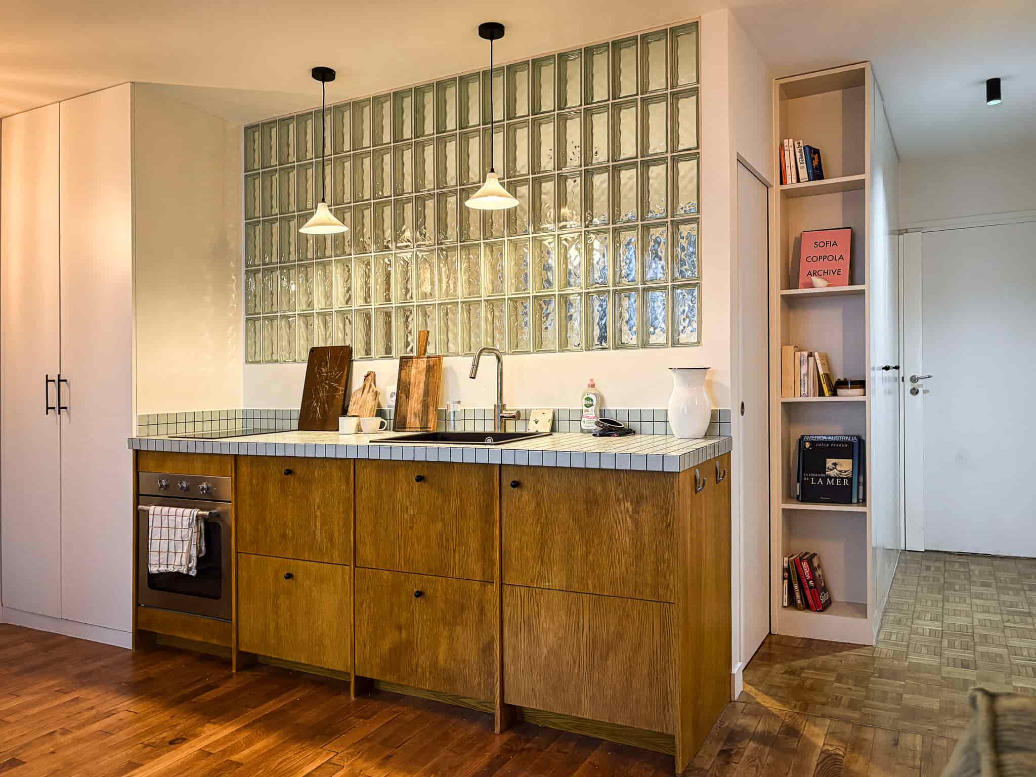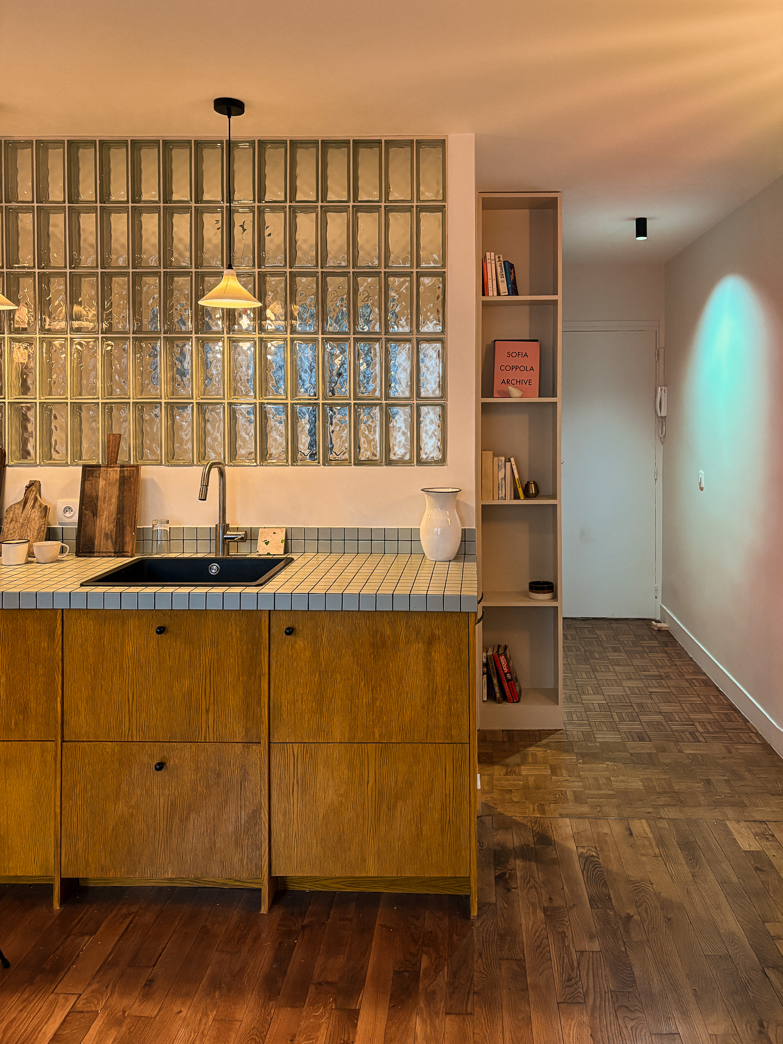 Appartement de 75 m² dans un immeuble des années 70. Réorganisation du plan, menuiseries en chêne, cloison de pavés de verre, parquet point de Hongrie.