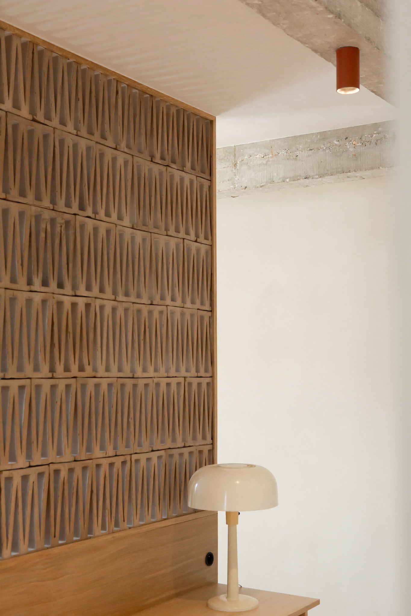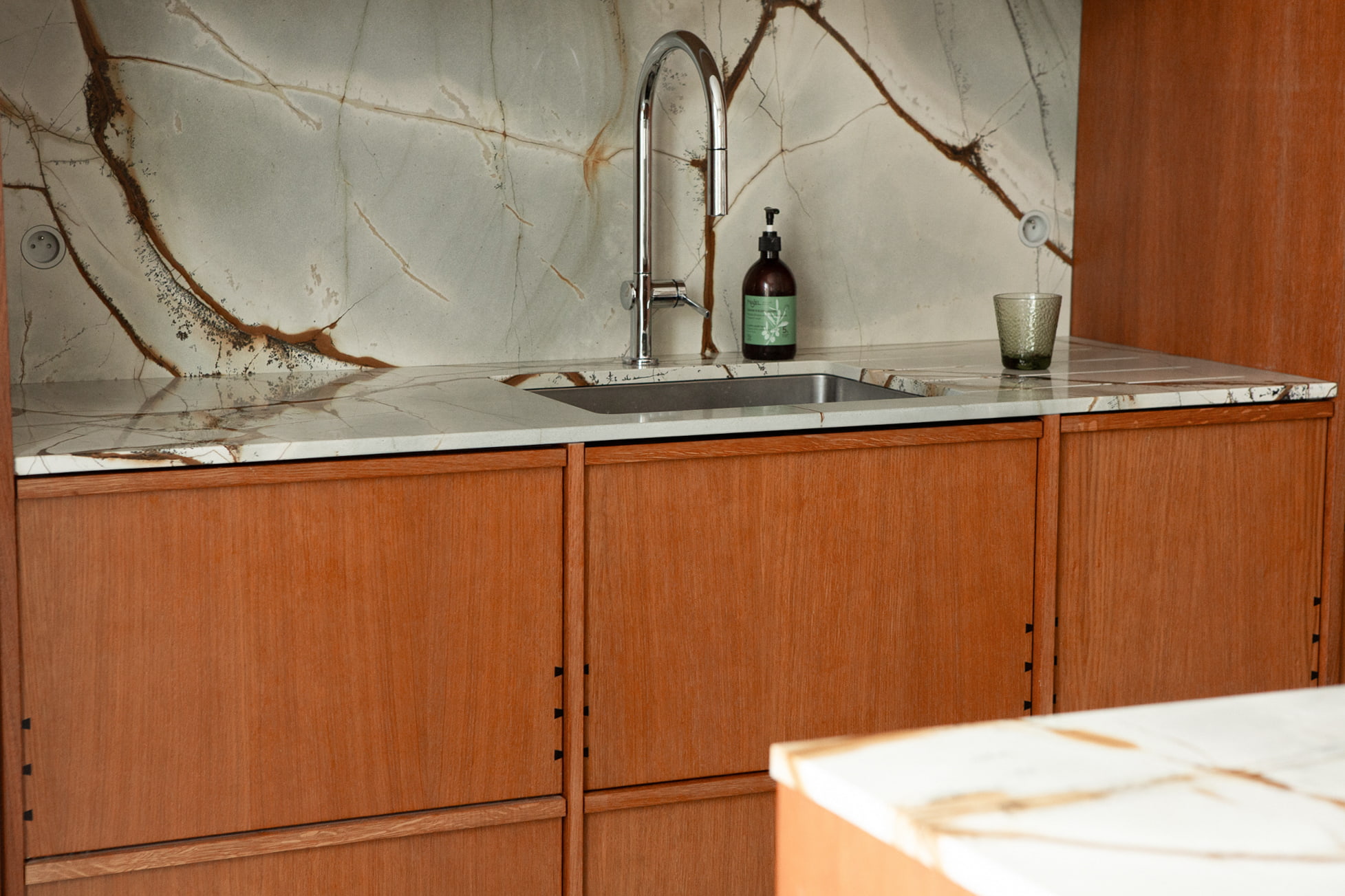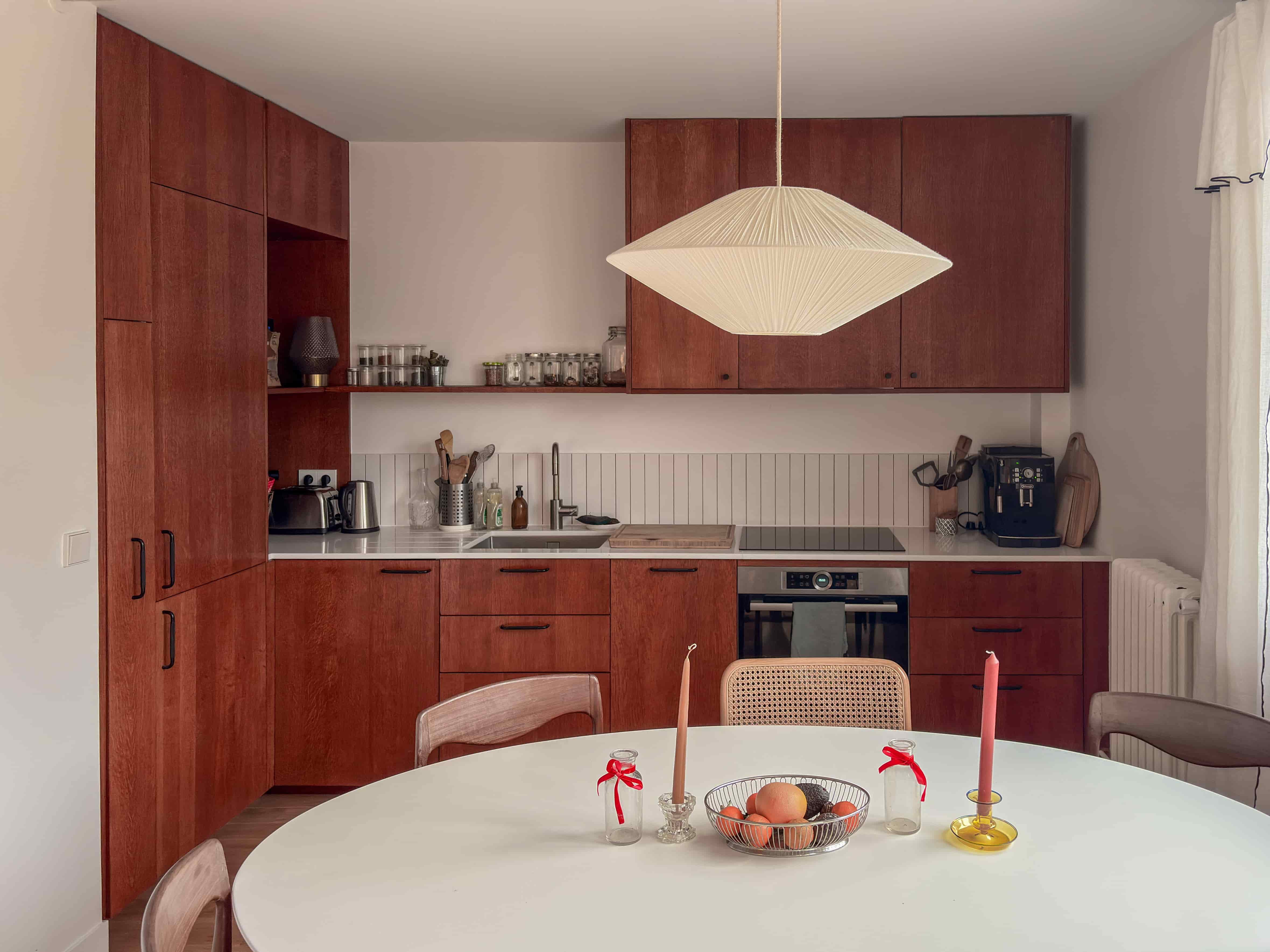 Le bois teinté terracotta apporte une chaleur immédiate qui répond à la minéralité du béton. L'entrée est traitée en terre cuite, sobre et ancrée. La cuisine joue le dialogue entre des façades en bois ancien au caractère affirmé et des éléments contemporains habillés de pierre du Brésil.