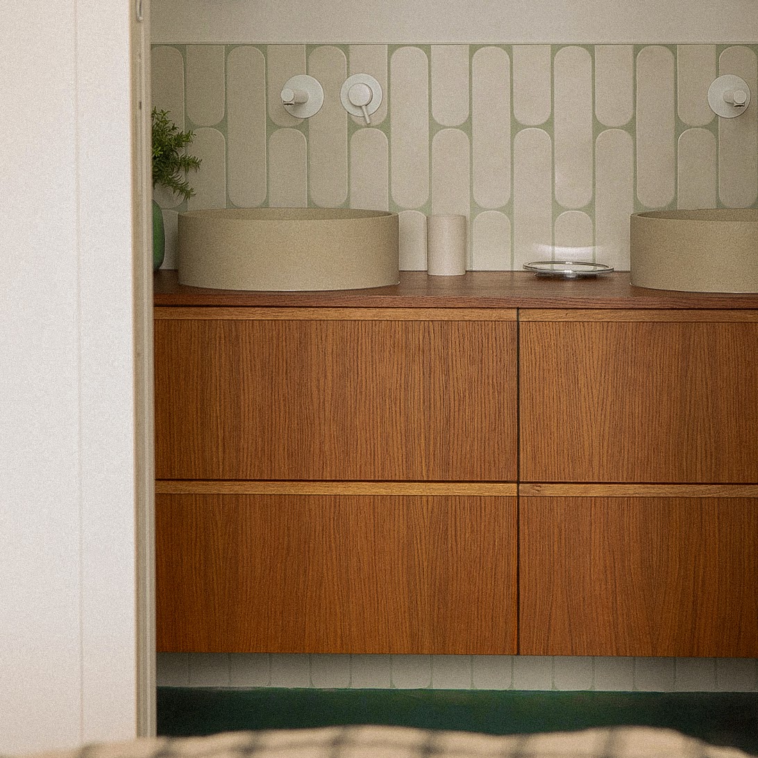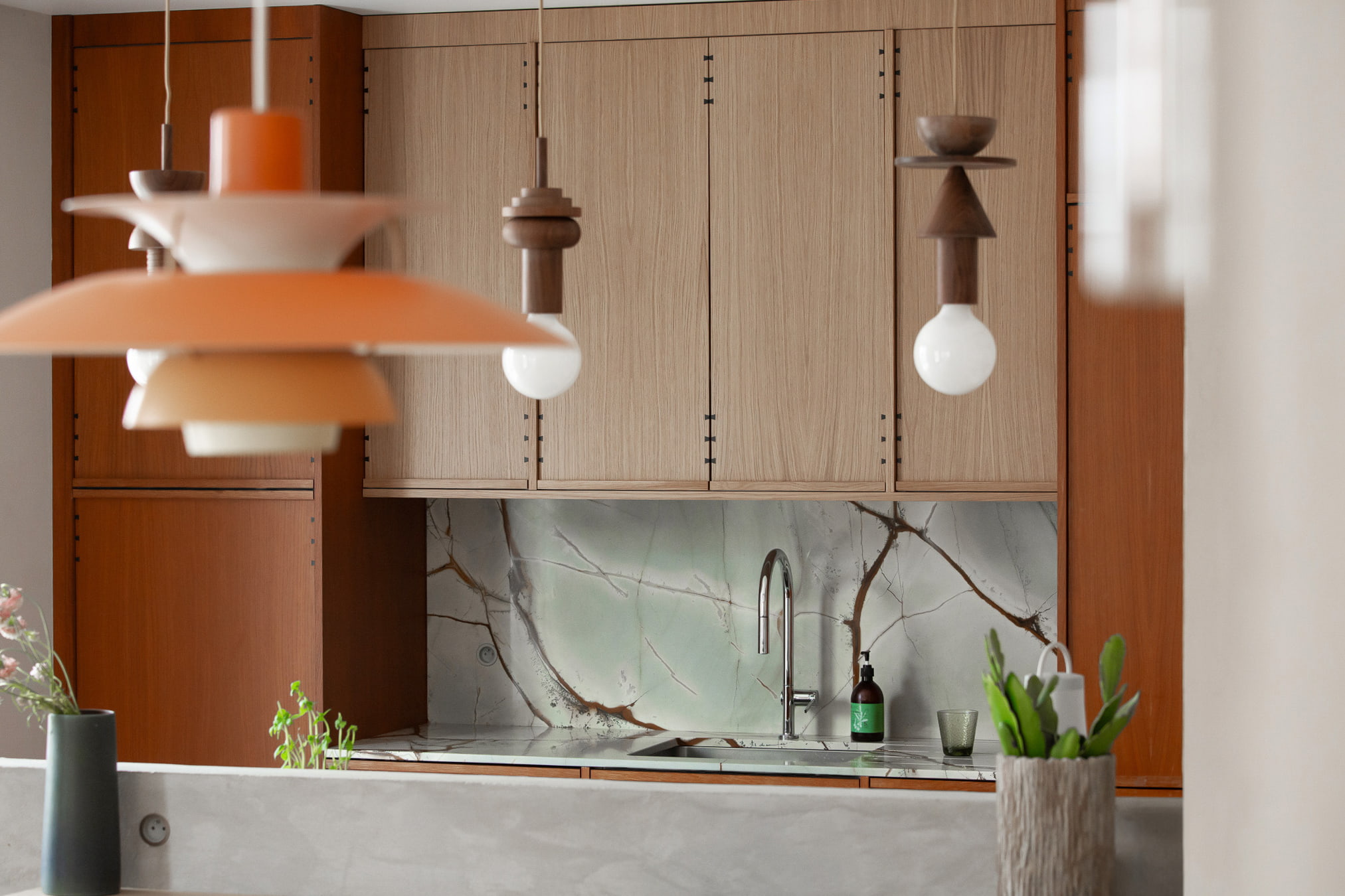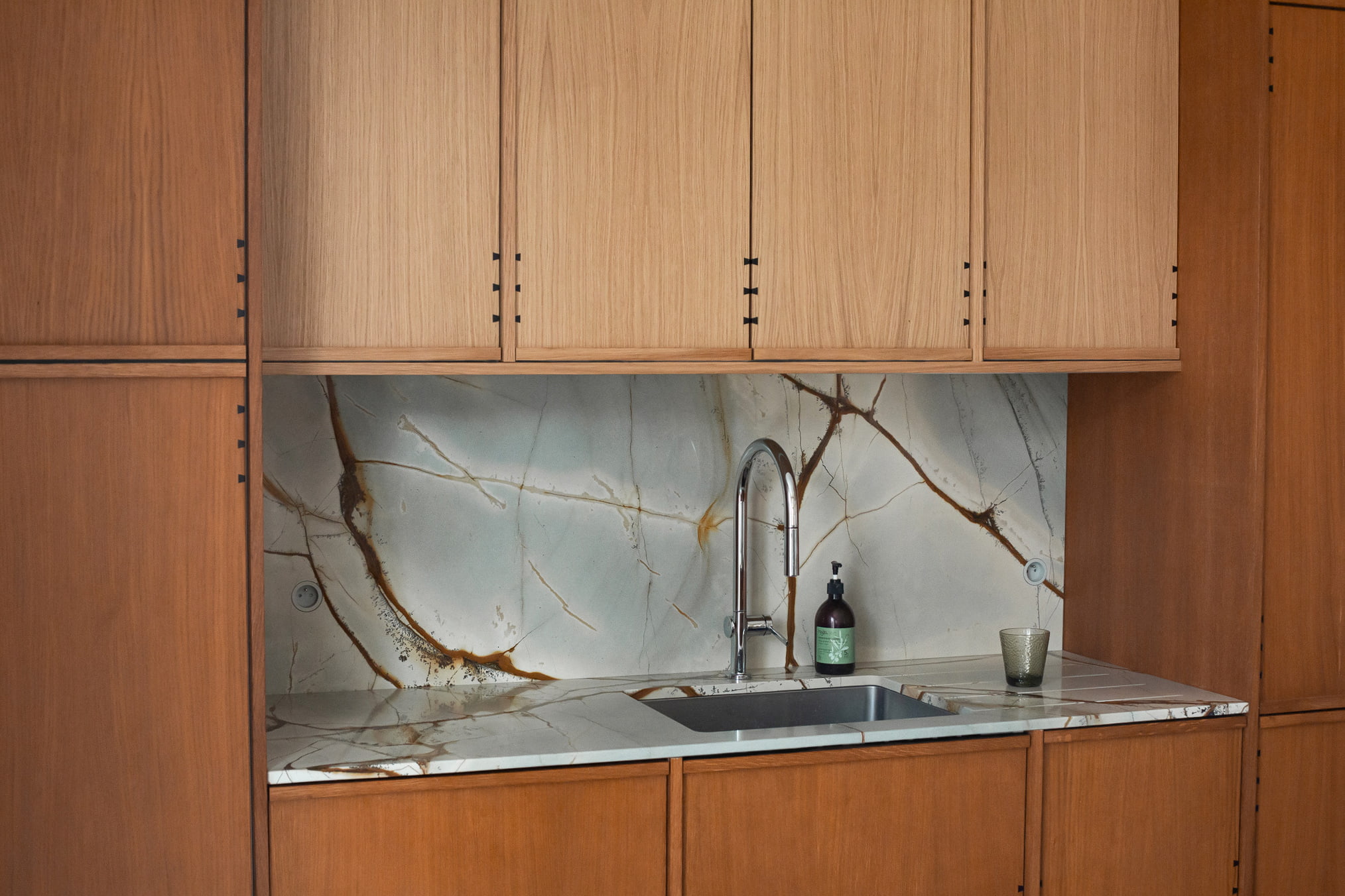 Le bois teinté terracotta apporte une chaleur immédiate qui répond à la minéralité du béton. L'entrée est traitée en terre cuite, sobre et ancrée. La cuisine joue le dialogue entre des façades en bois ancien au caractère affirmé et des éléments contemporains habillés de pierre du Brésil.