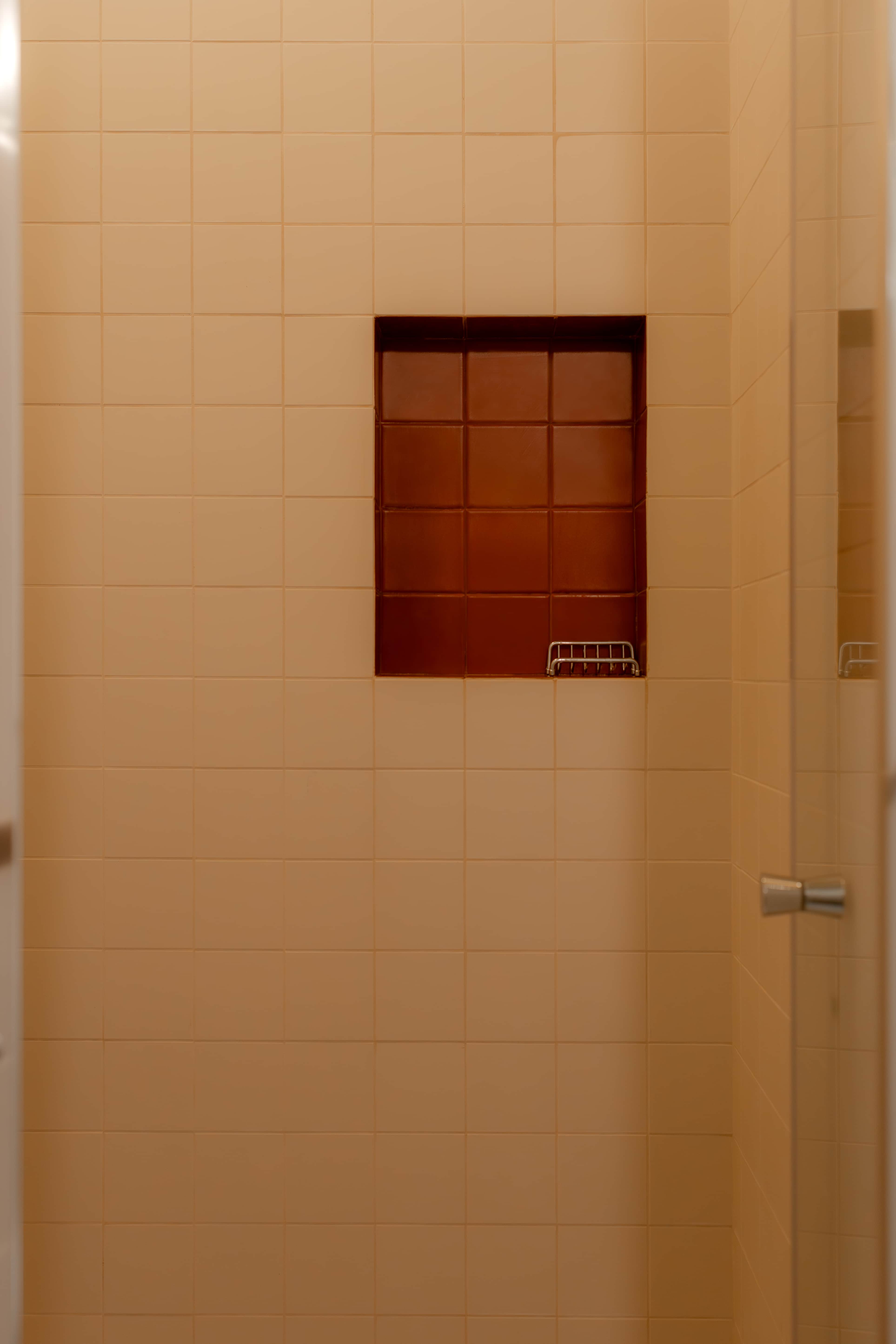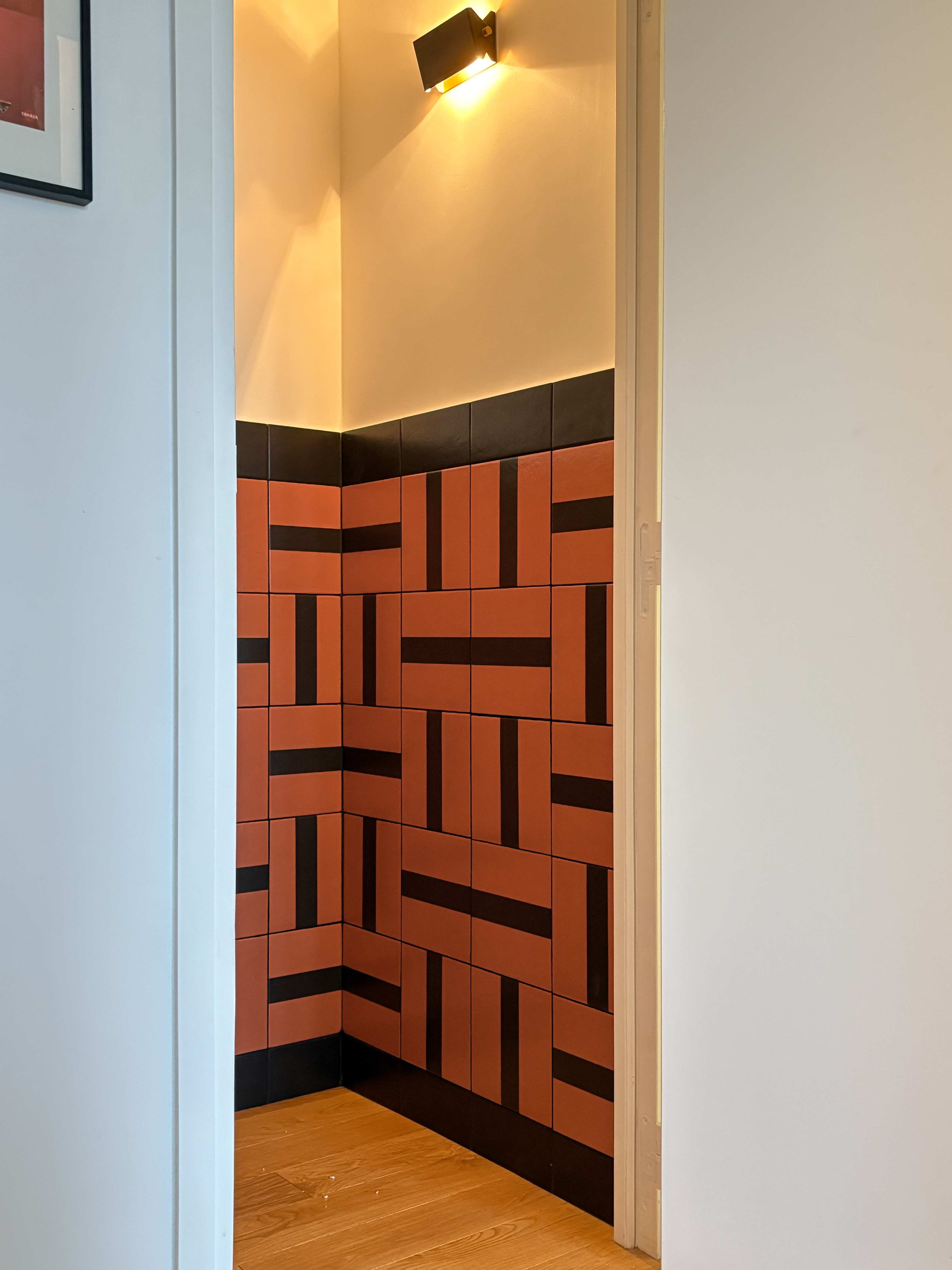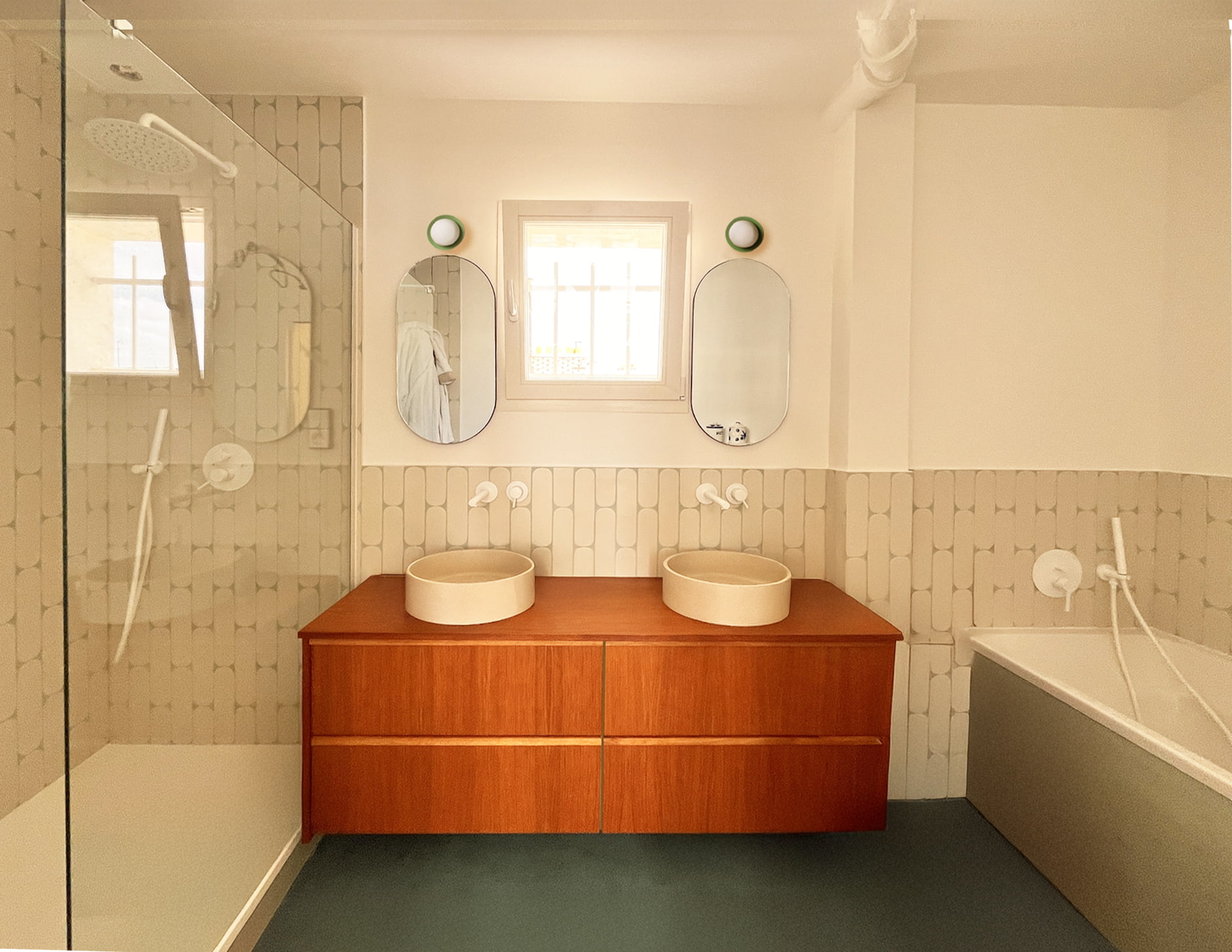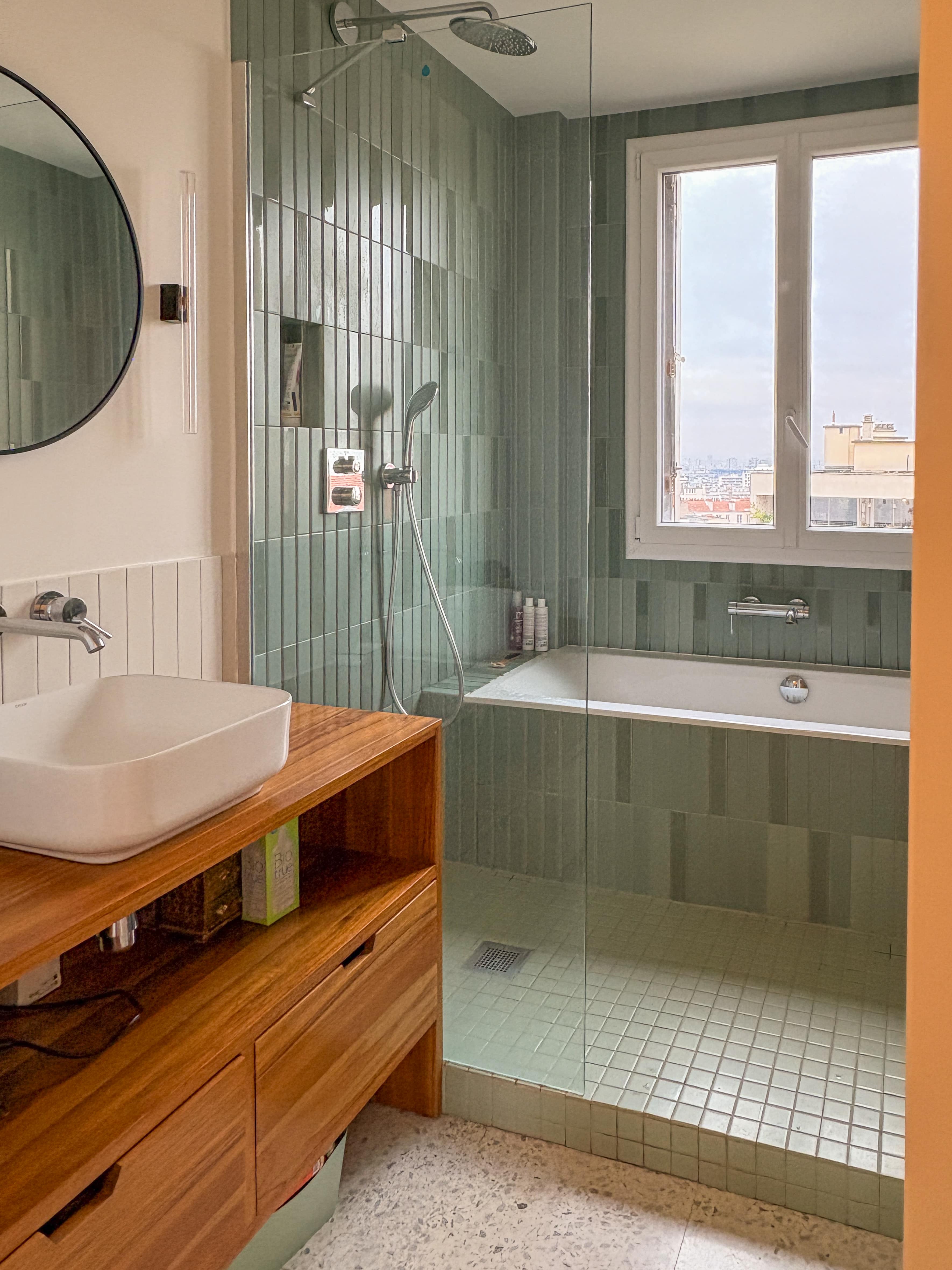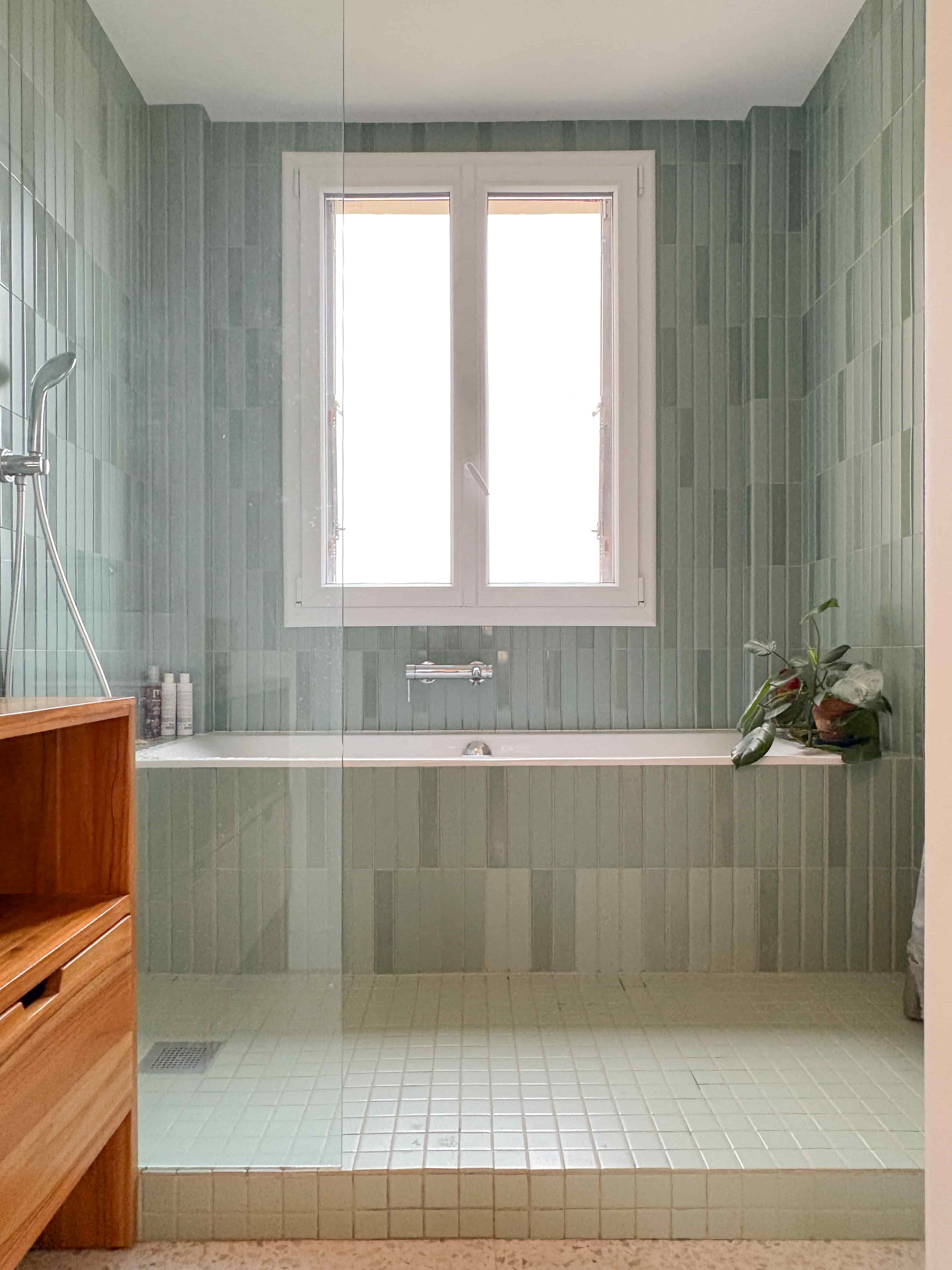 La salle de bain a été entièrement repensée : baignoire et douche cohabitent dans un espace unitaire, la baignoire disparaissant dans son habillage carrelé — même matière, même texture, continuité totale. La double texture du carrelage crée un jeu subtil entre surfaces.