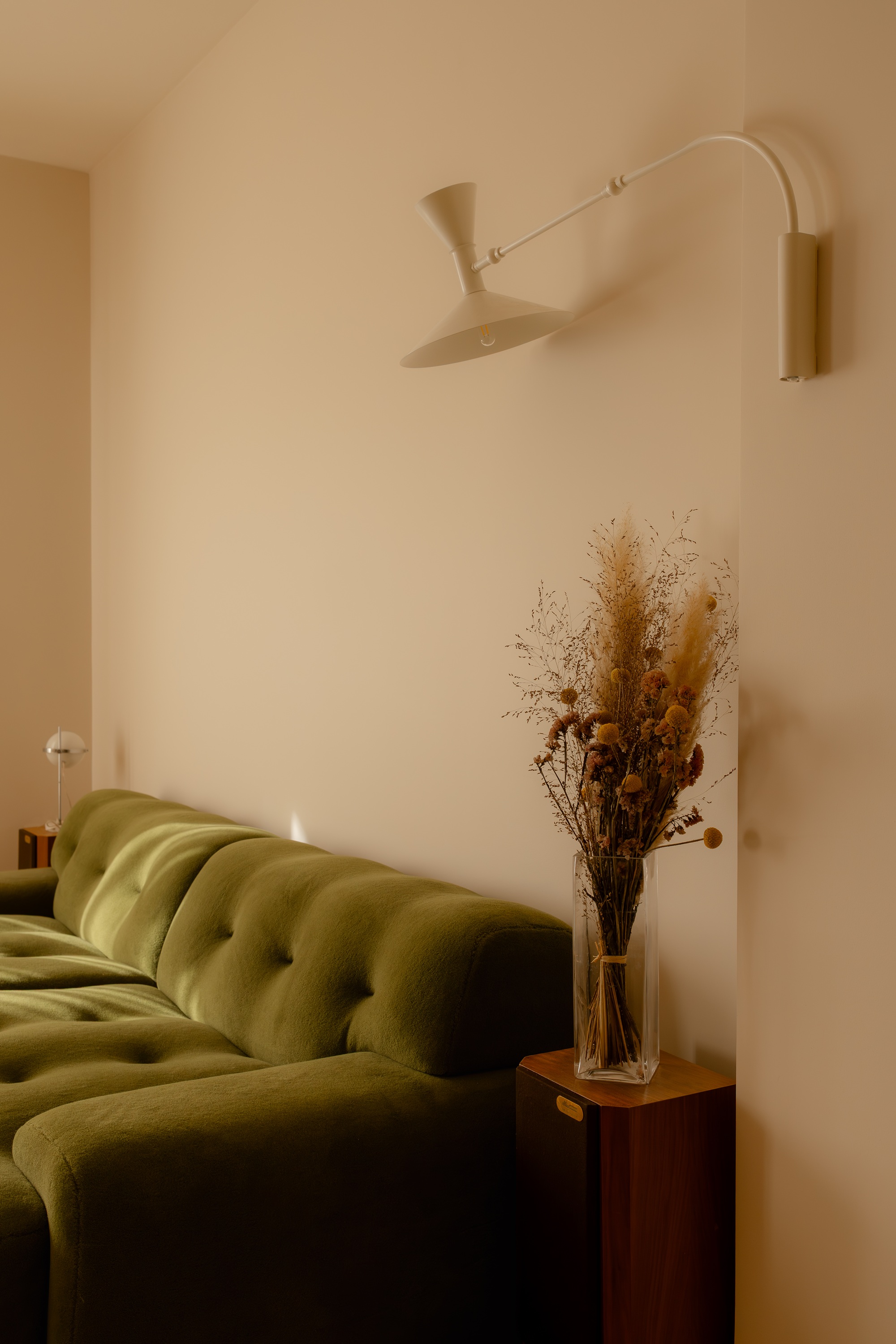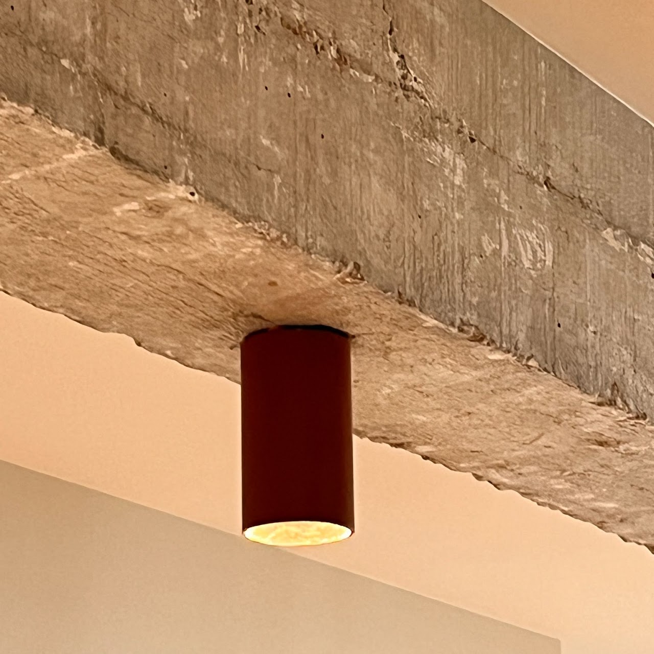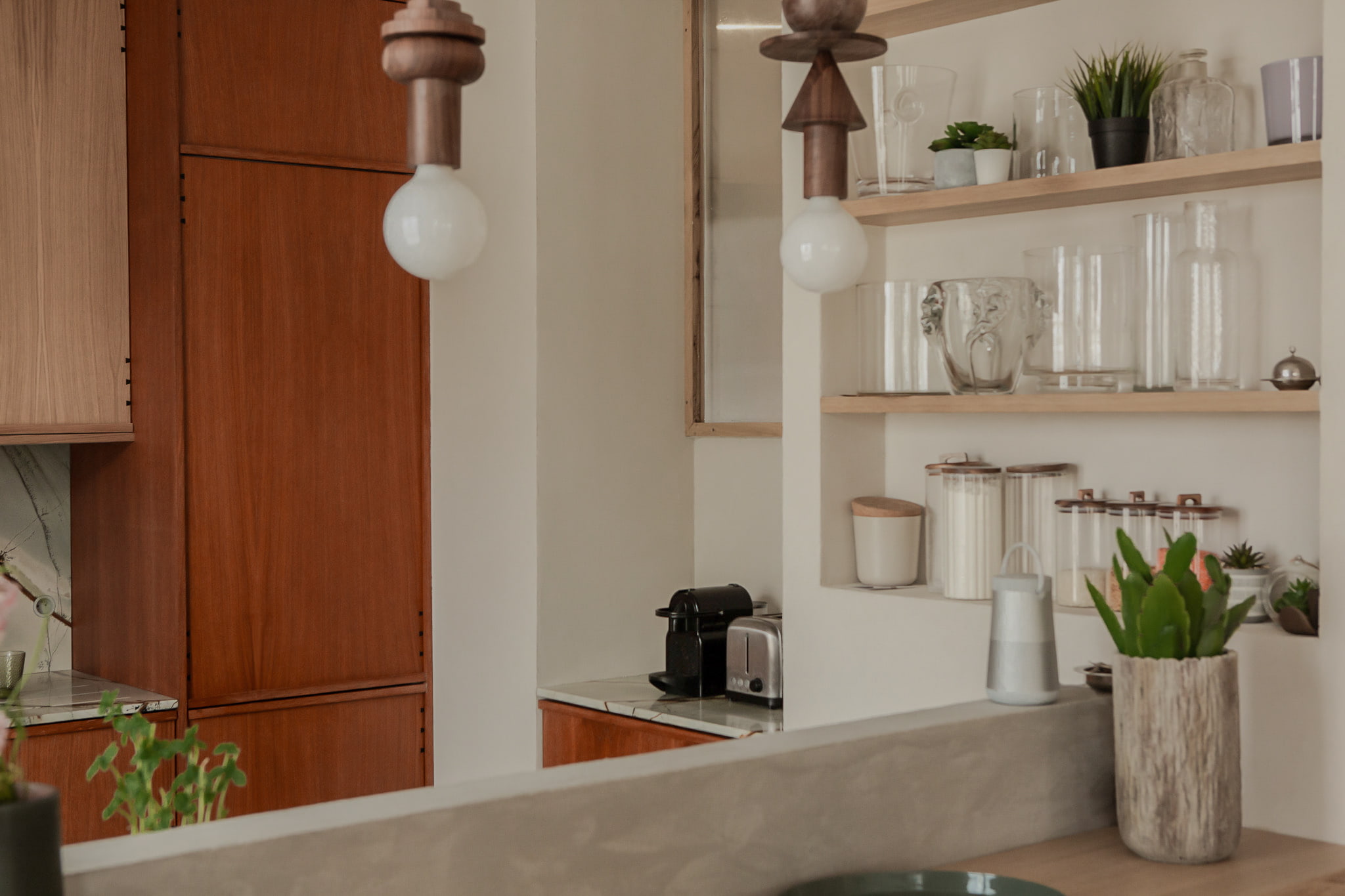 Dépose intégrale des aménagements existants, décloisonnement, ouverture de la cuisine sur le séjour : la réorganisation spatiale a été complète. Les poutres et poteaux en béton sont réapparus, devenus le point de départ du projet d'ambiance.