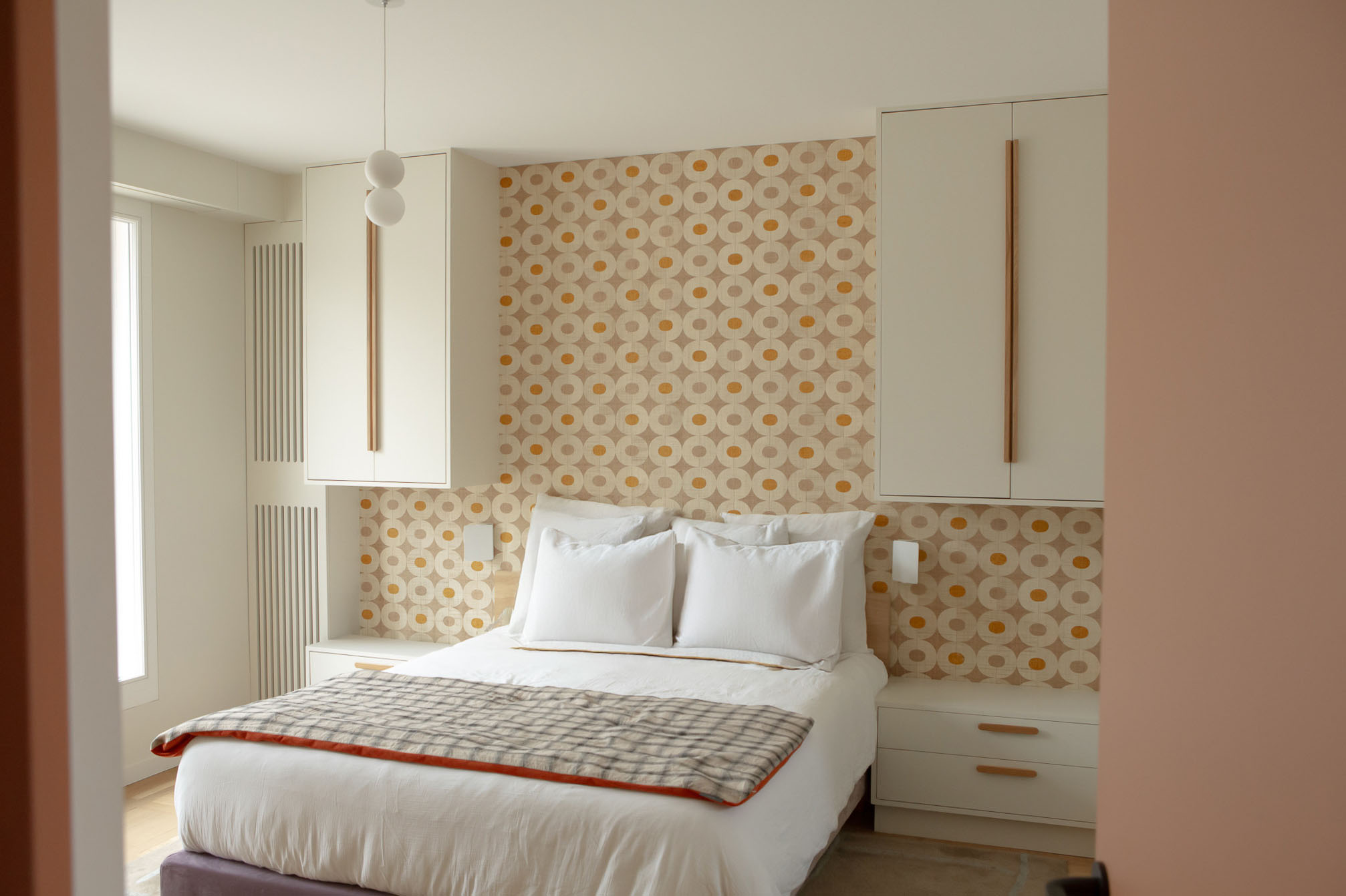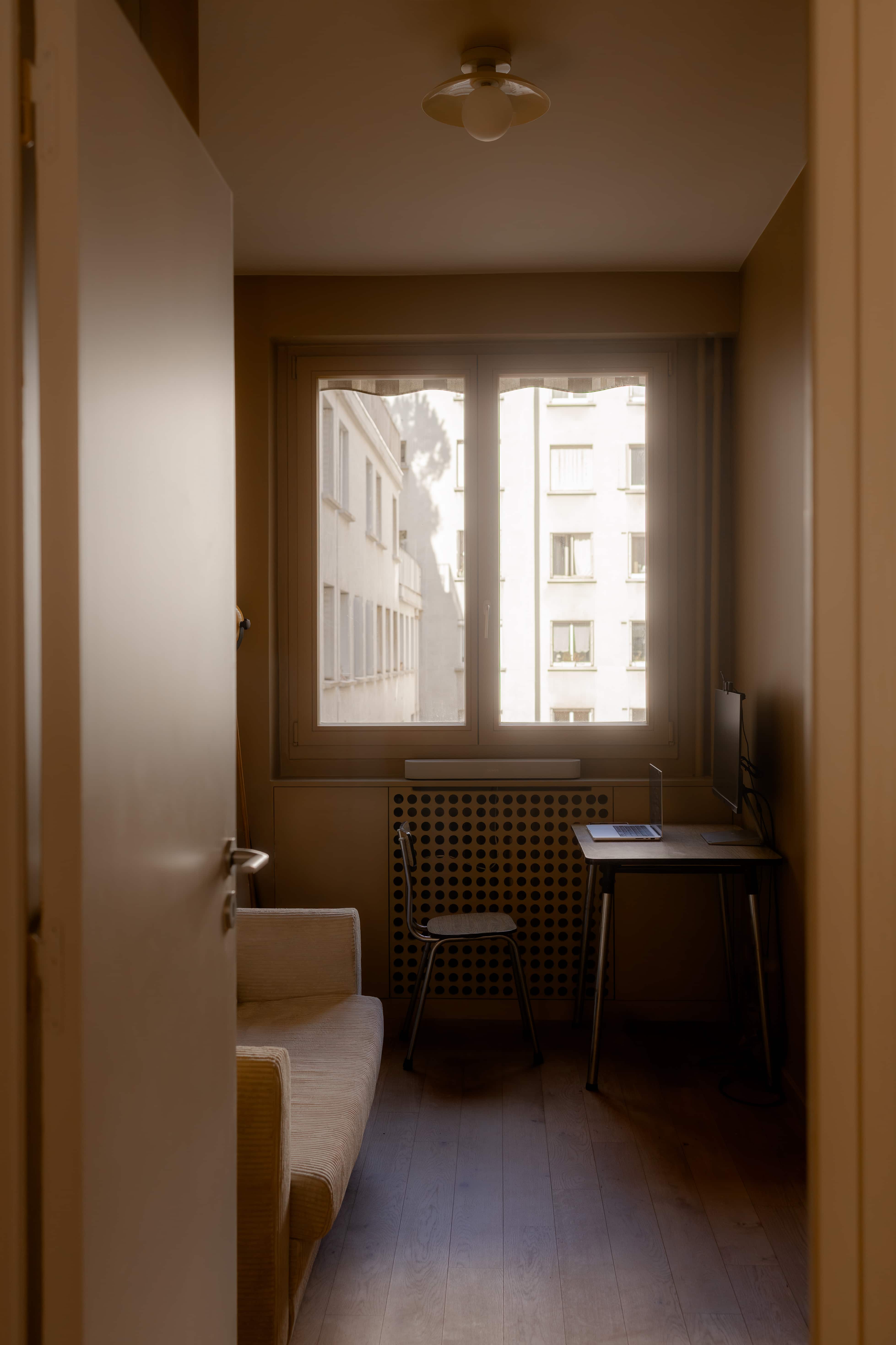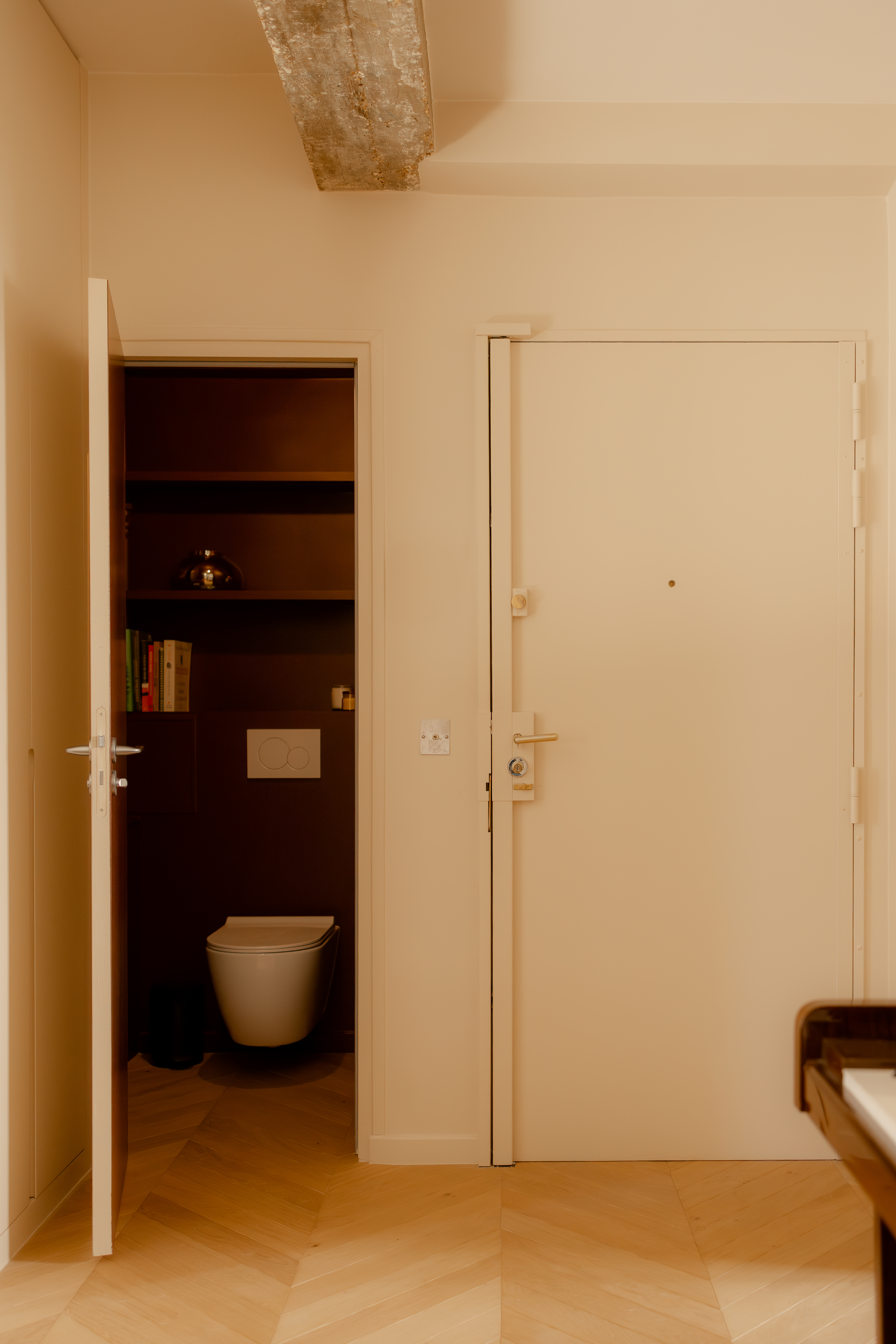 Le béton ciré habille la chambre, apportant une minéralité calme. Le parquet d'origine est conservé dans l'entrée et le couloir, maintenant le lien avec le caractère de l'immeuble. Rénovation complète avec doublage intégral des murs.