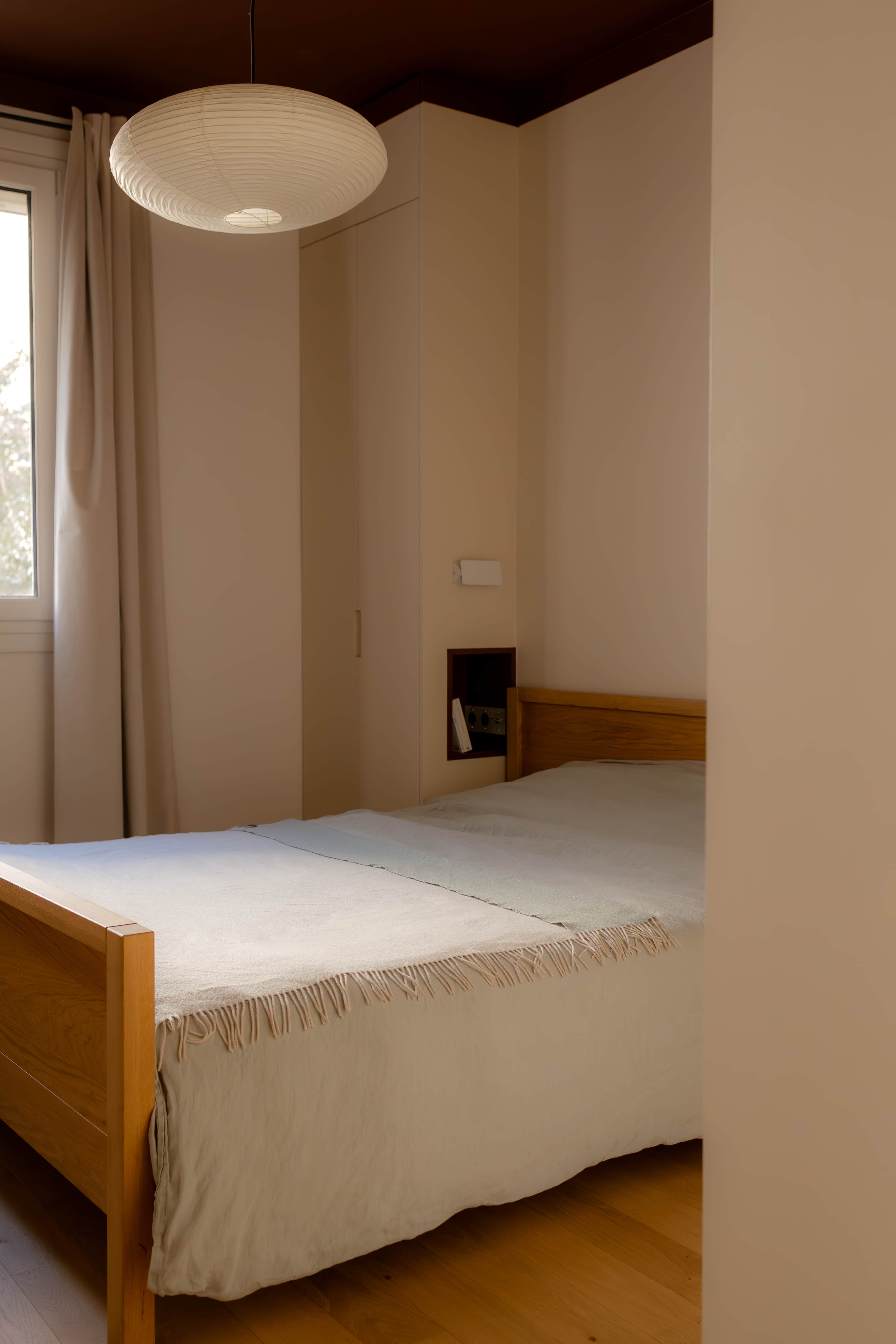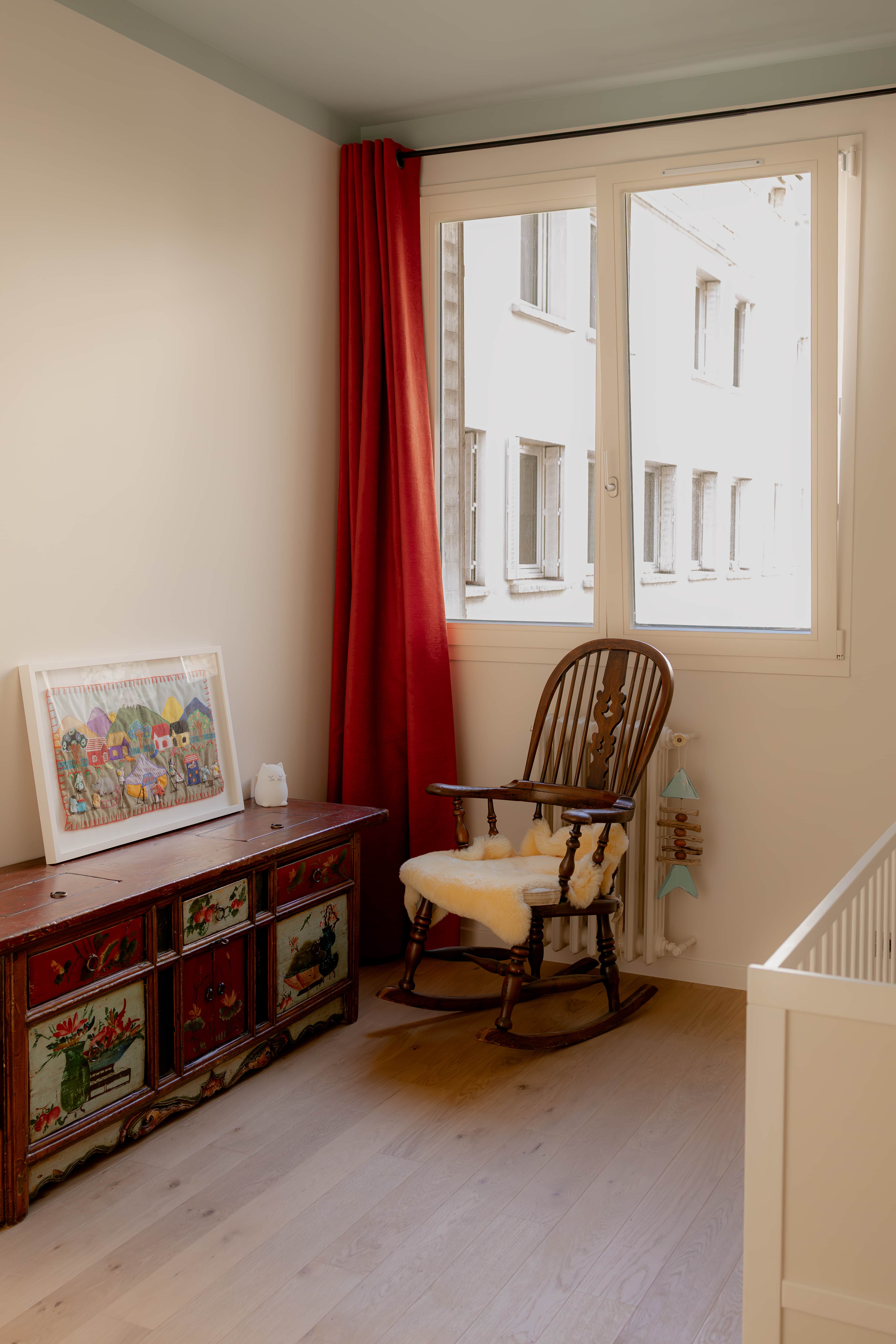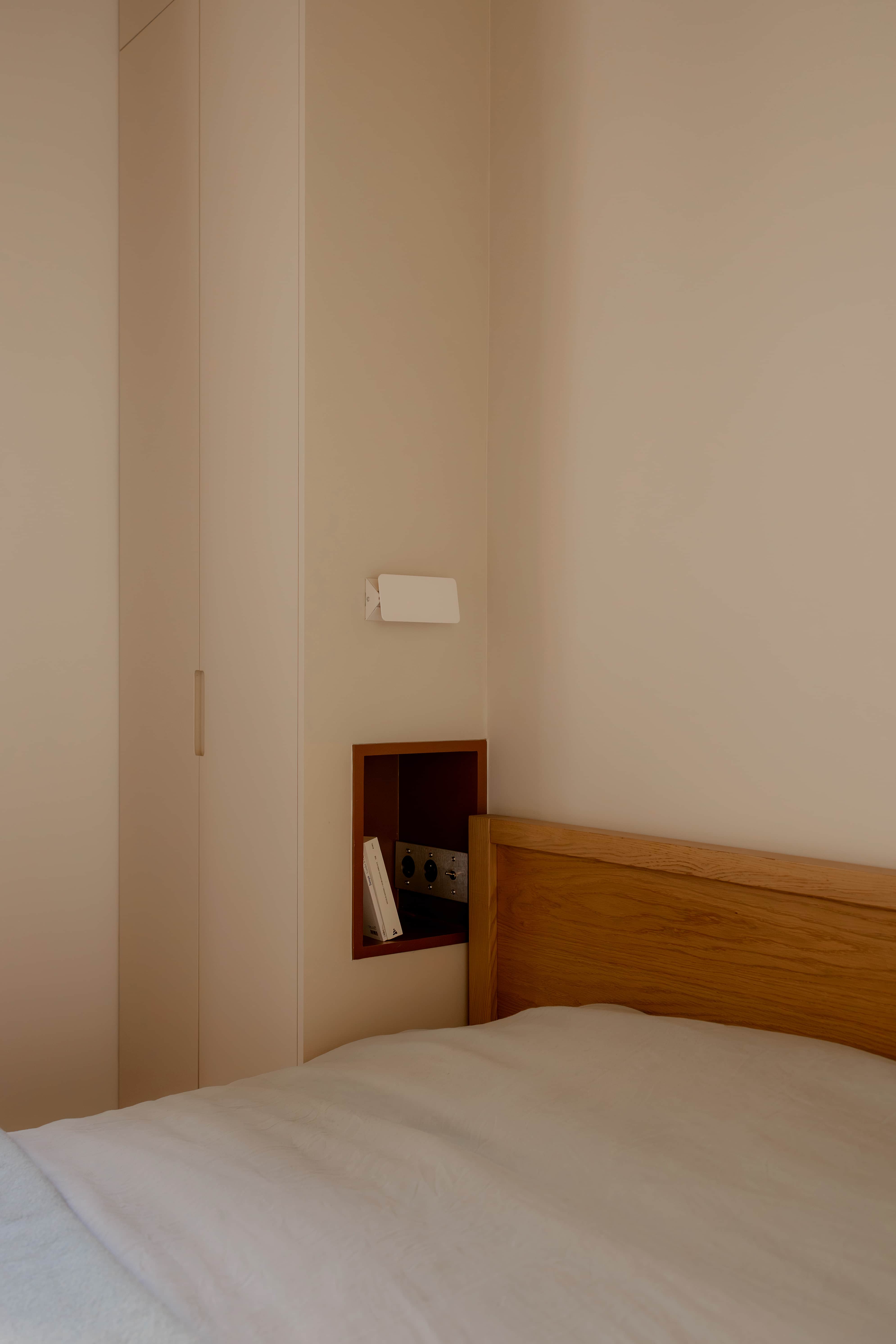 Le béton ciré habille la chambre, apportant une minéralité calme. Le parquet d'origine est conservé dans l'entrée et le couloir, maintenant le lien avec le caractère de l'immeuble. Rénovation complète avec doublage intégral des murs.