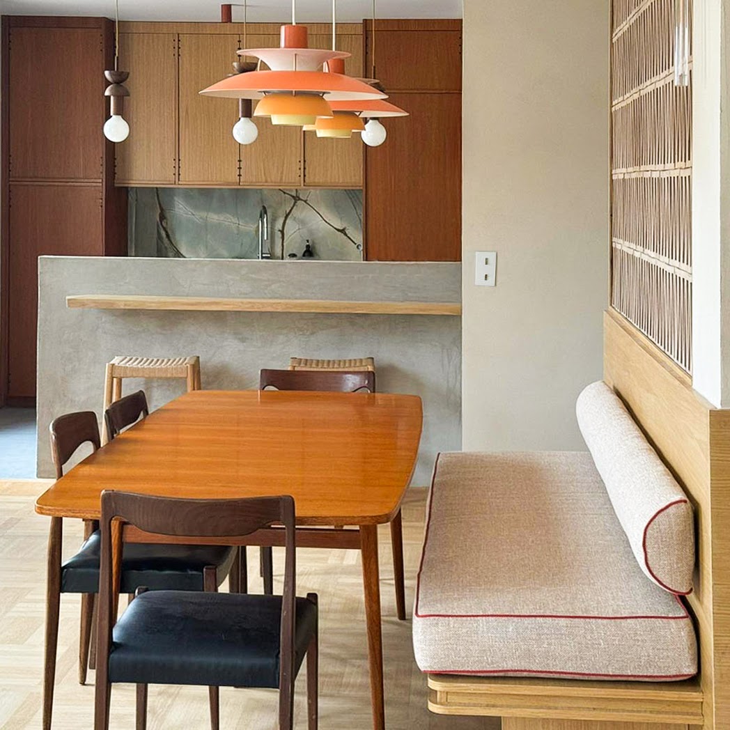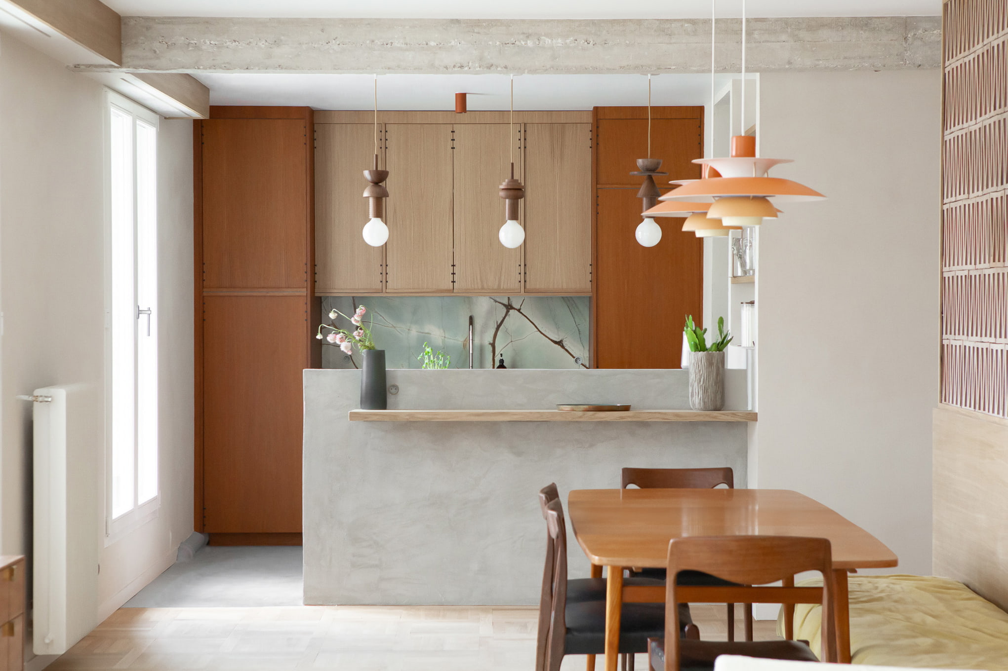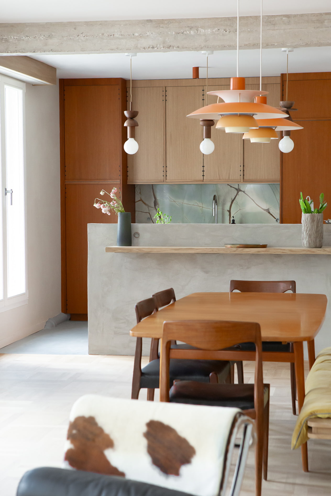 Appartement de 150 m² des années 1970. Décloisonnement complet, mise en valeur des poutres béton. Bois teinté terracotta, entrée en terre cuite, cuisine entre bois ancien et pierre du Brésil.