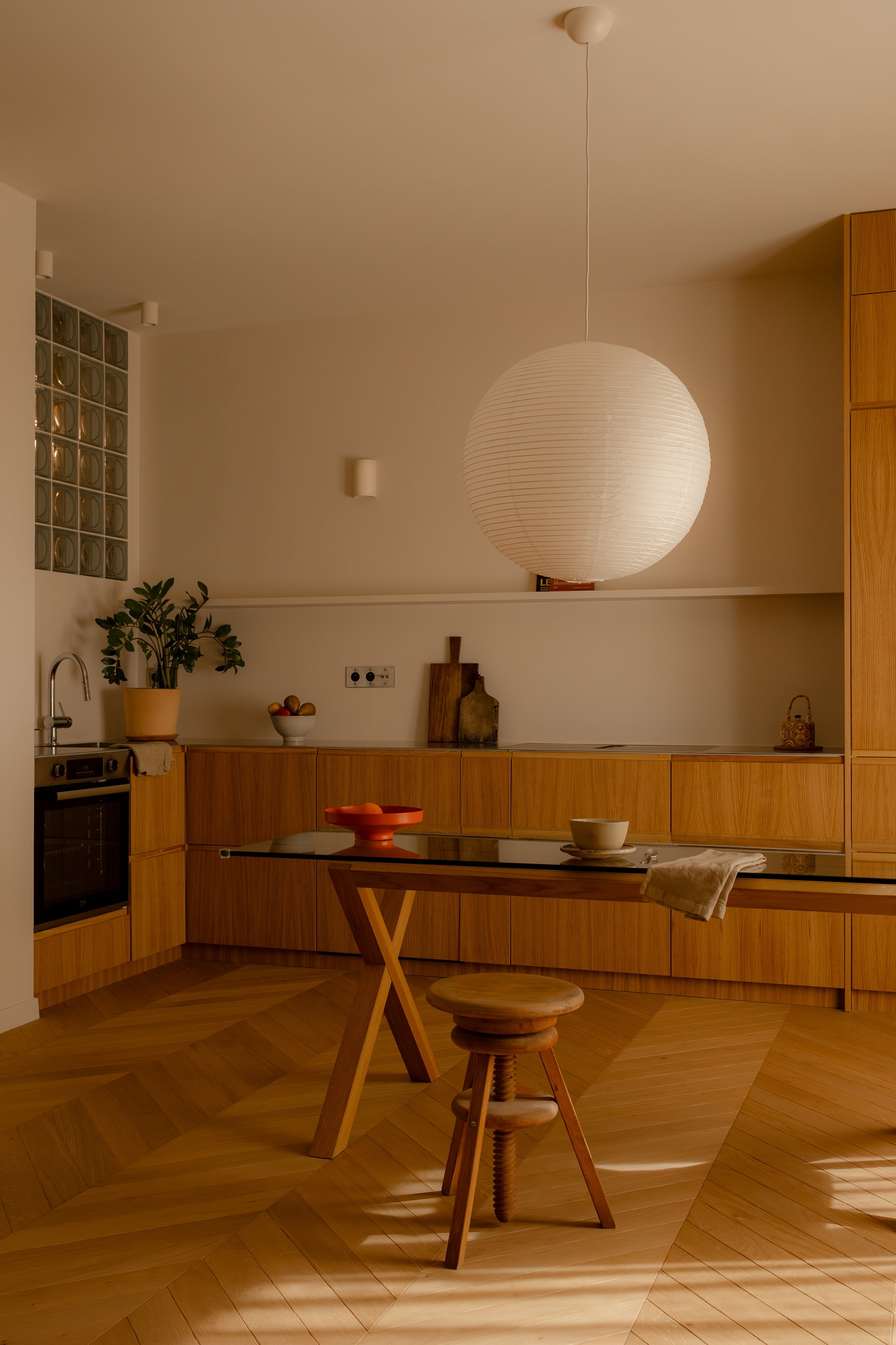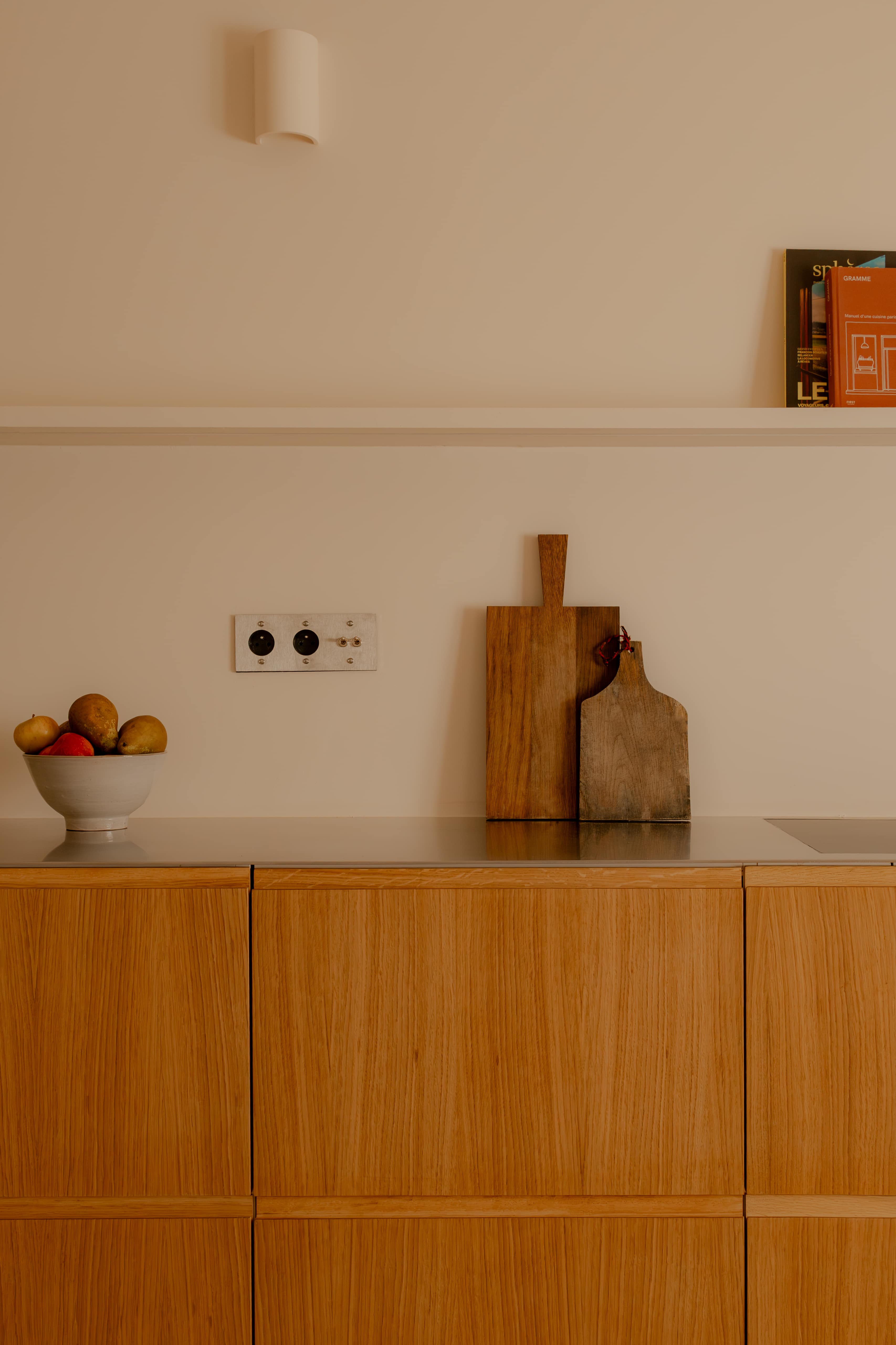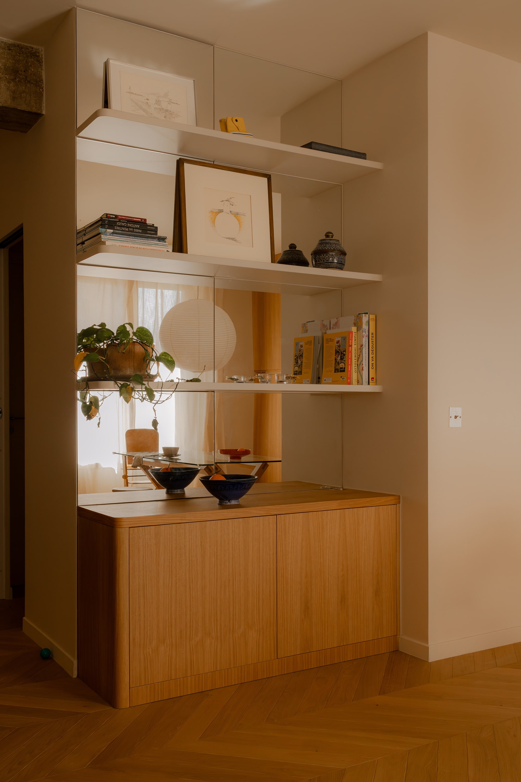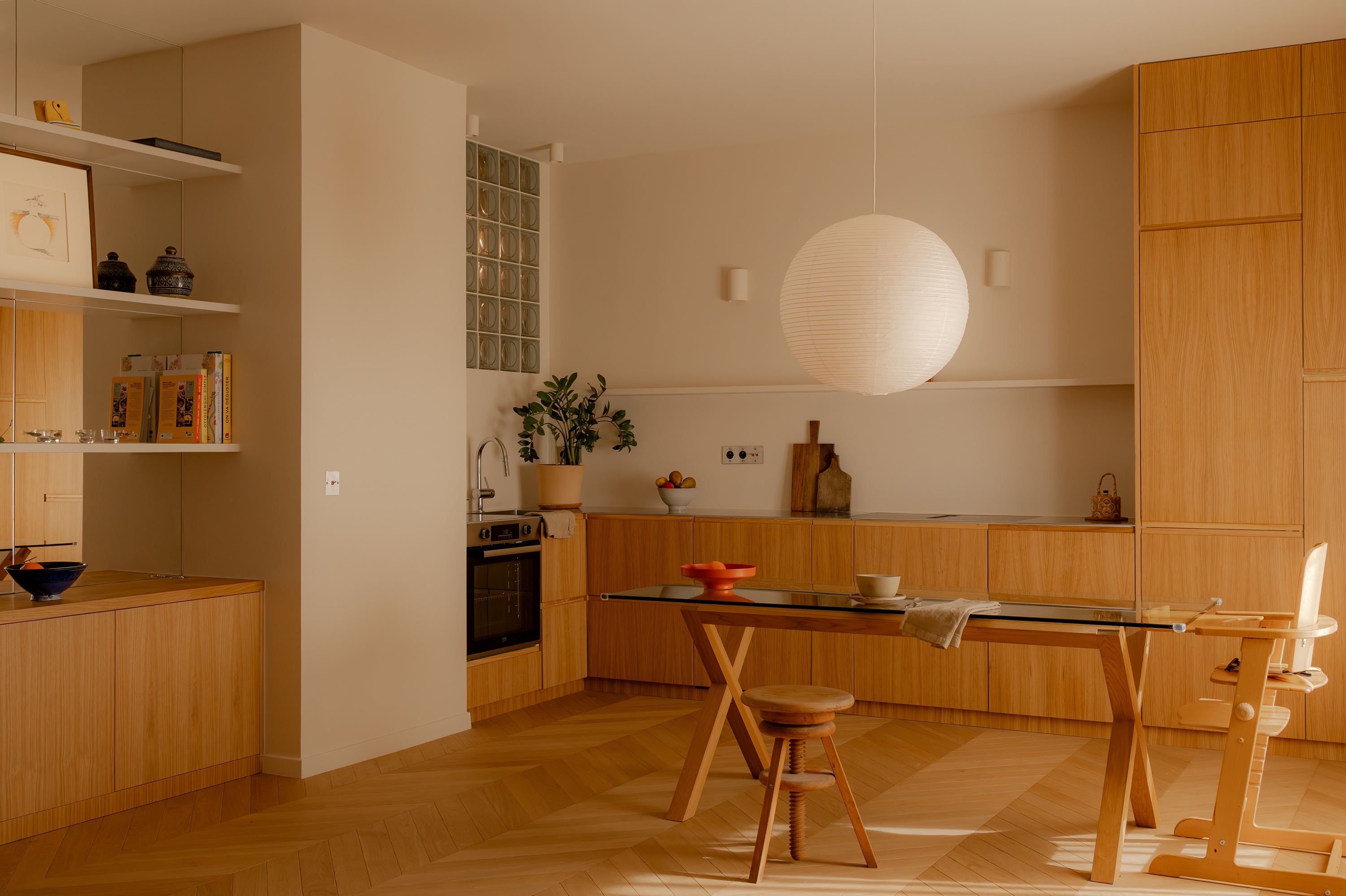 Le parquet posé en pose droite structure l'appartement. La cuisine en bois dialogue avec les menuiseries sur mesure et la bibliothèque du salon : même écriture, même soin du détail, d'un bout à l'autre du plan.