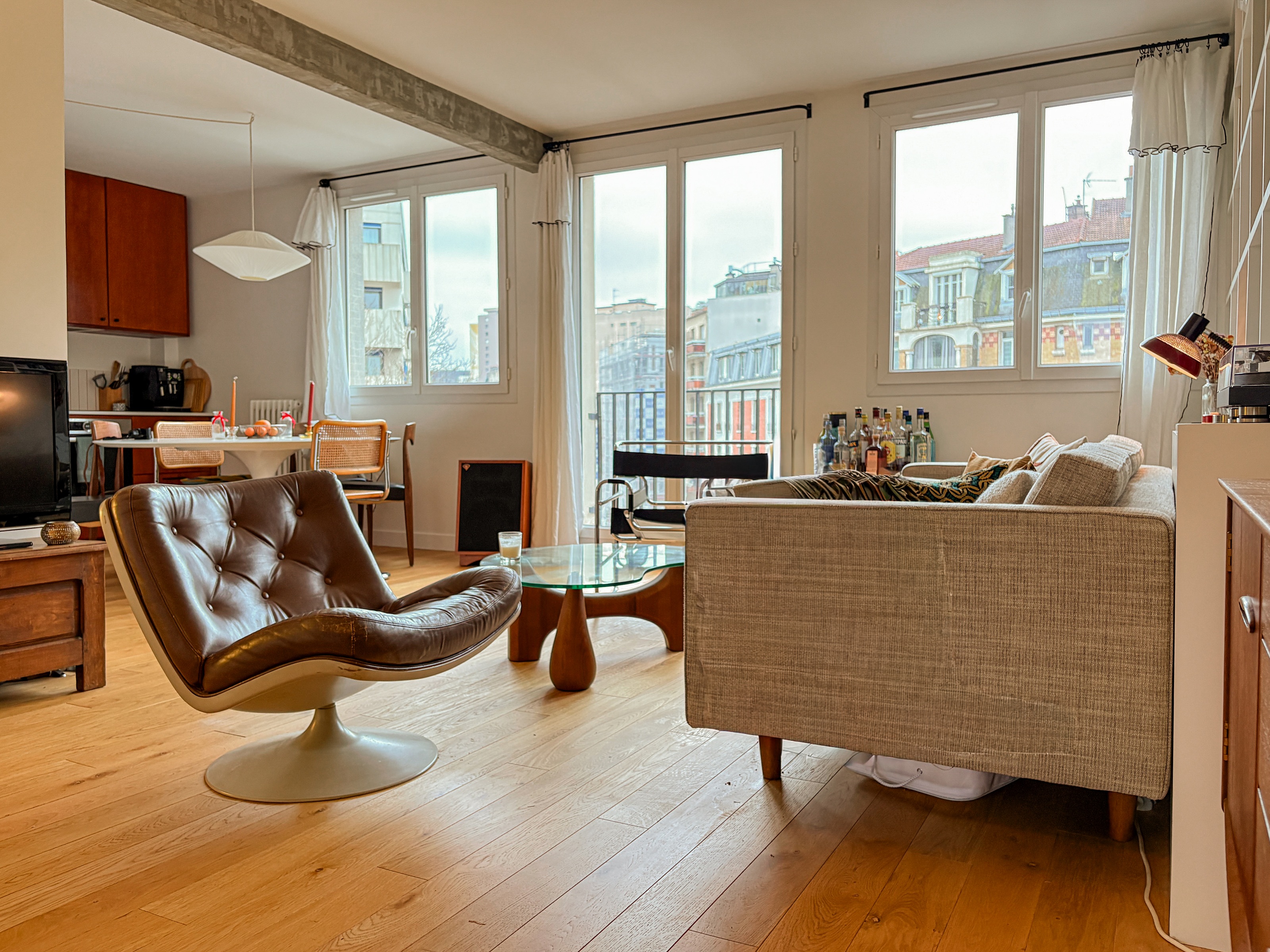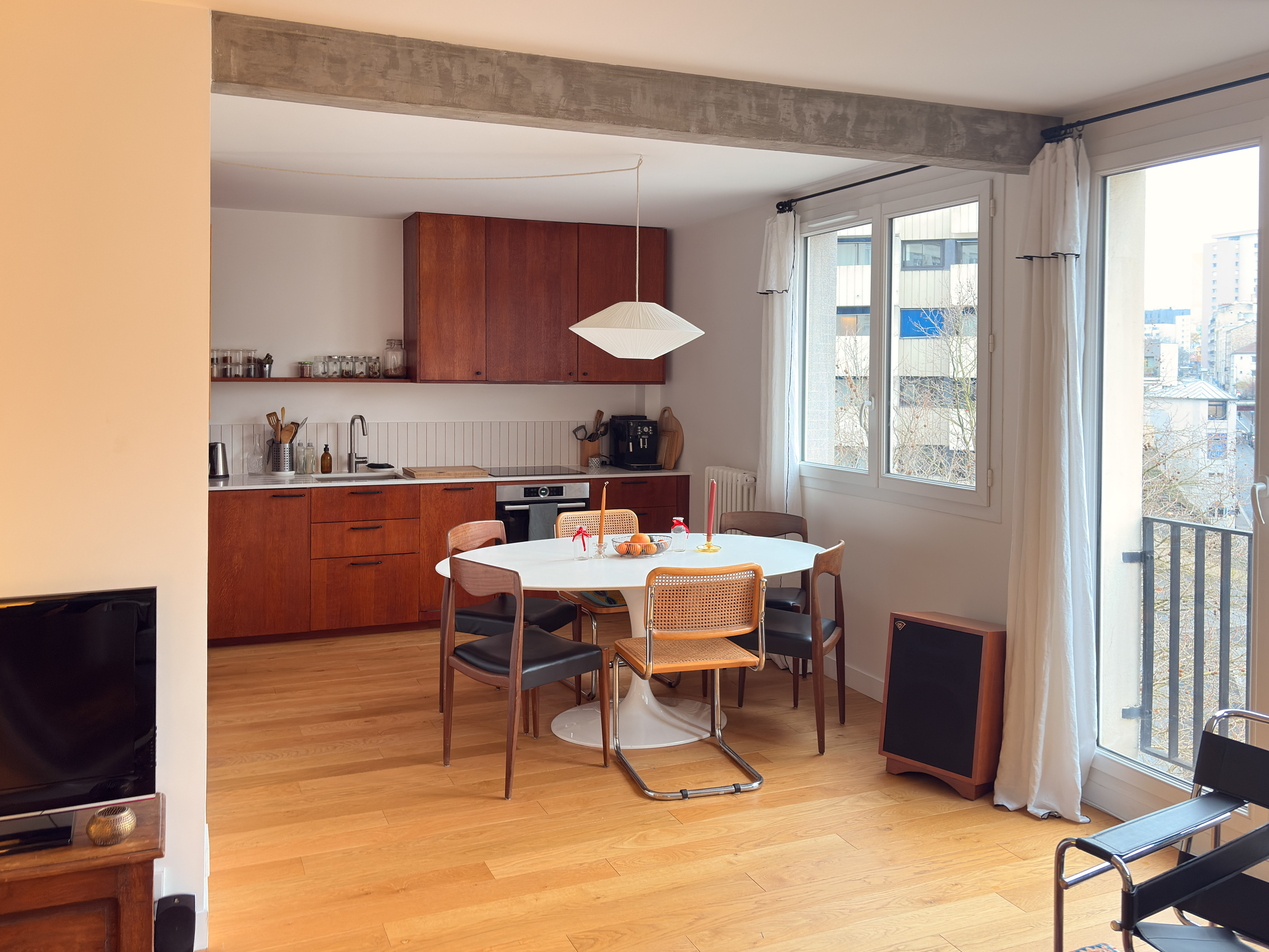 Appartement de 65 m² dans le 19e arrondissement. Rénovation complète d'un trois-pièces dont la distribution d'origine ne tirait pas parti du potentiel des volumes. La cuisine a été déplacée dans la pièce de vie, créant un espace ouvert et fluide.