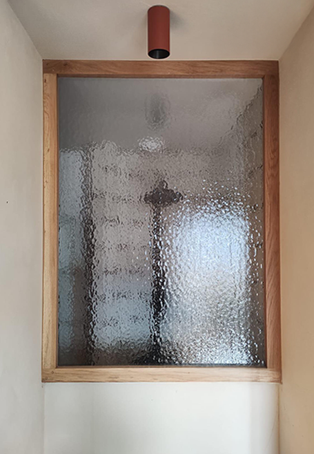 La chambre bénéficie d'un apport de lumière naturelle grâce à une verrière en pavés de verre en hauteur sur le salon — solution qui préserve l'intimité tout en diffusant une lumière douce et continue.