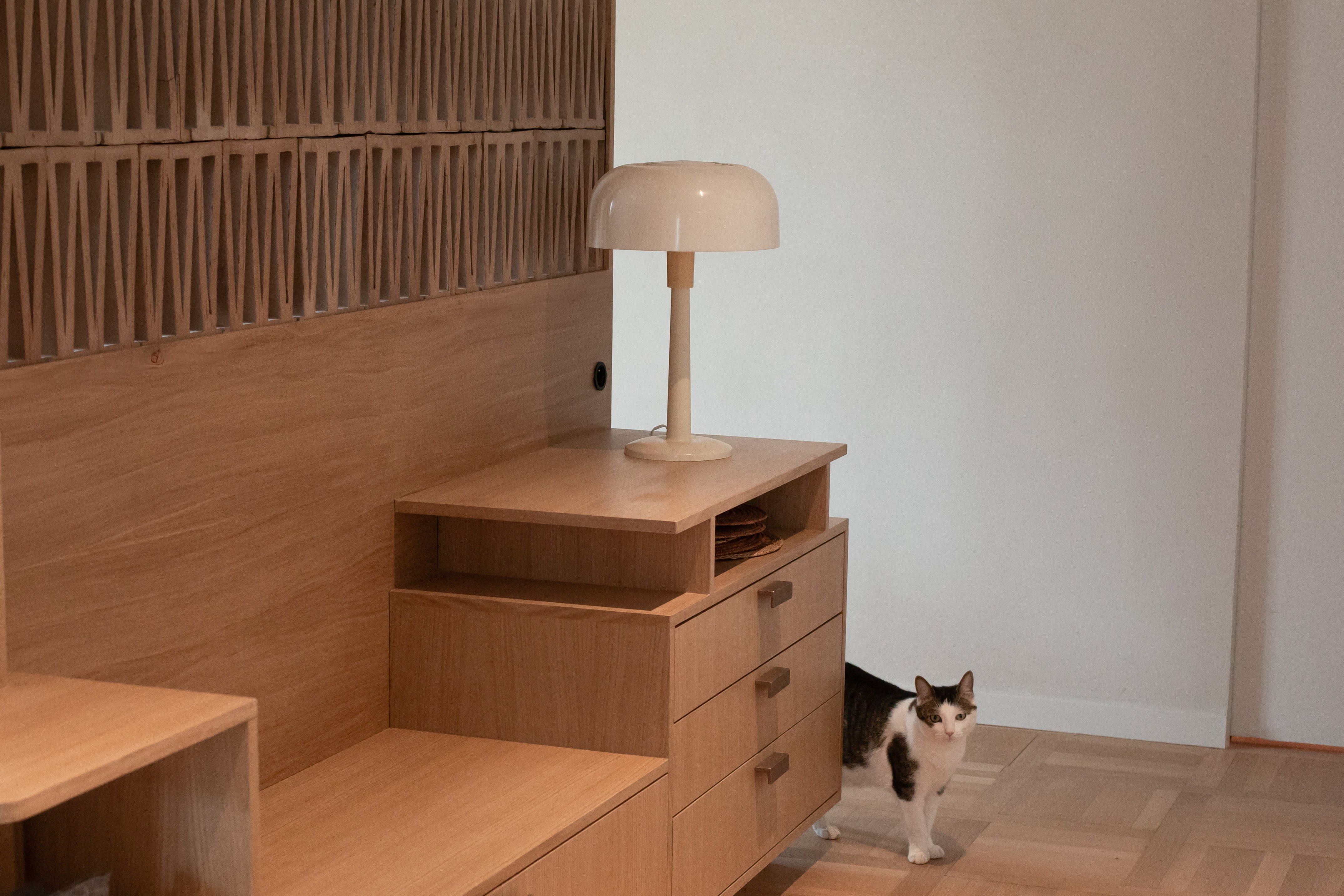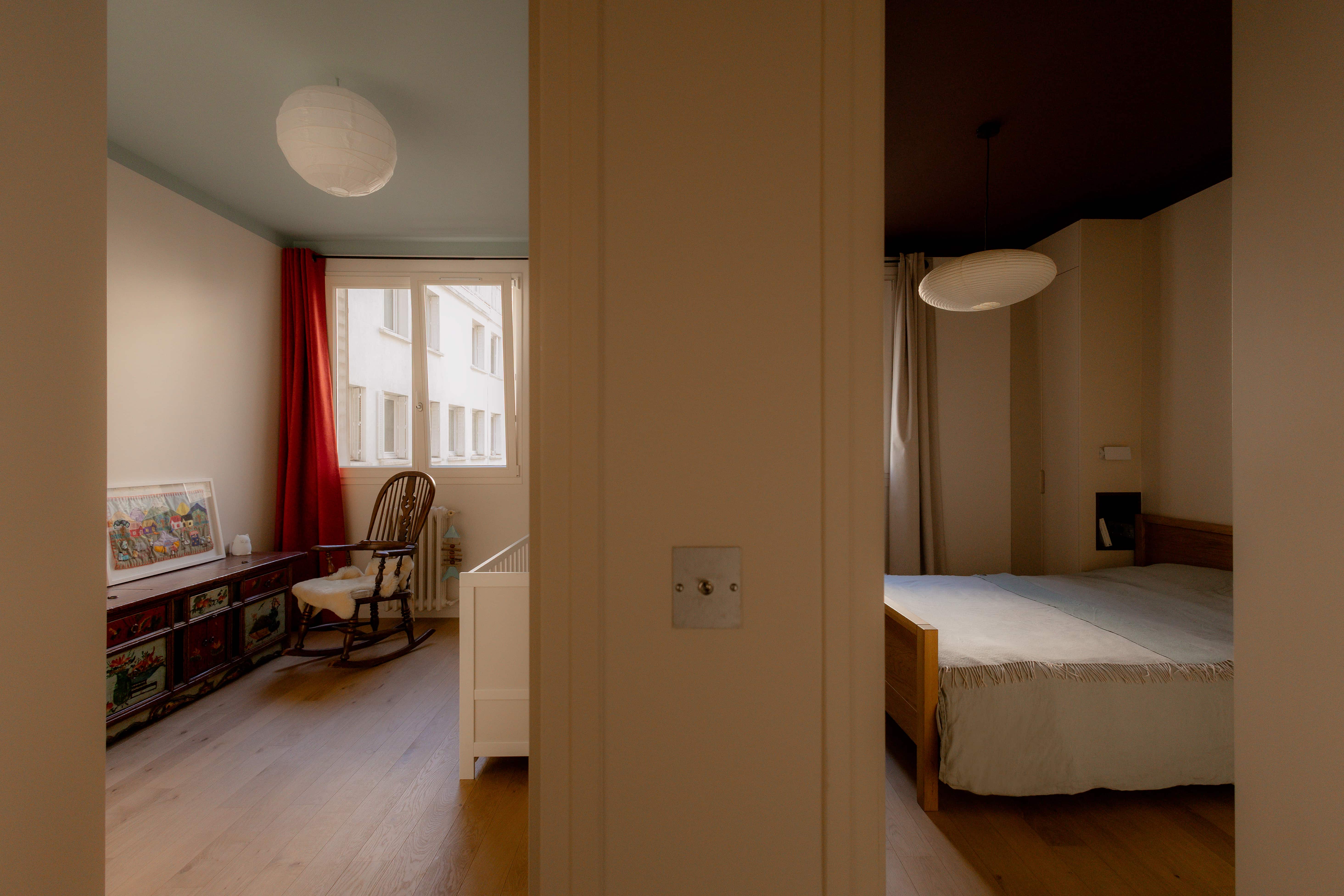 Appartement situé dans un immeuble des années 1930 dans le 14e arrondissement. Transformation complète d'un studio en véritable deux-pièces : création d'une chambre séparée et d'une salle de bain dans un appartement contraint par sa surface et son exposition.