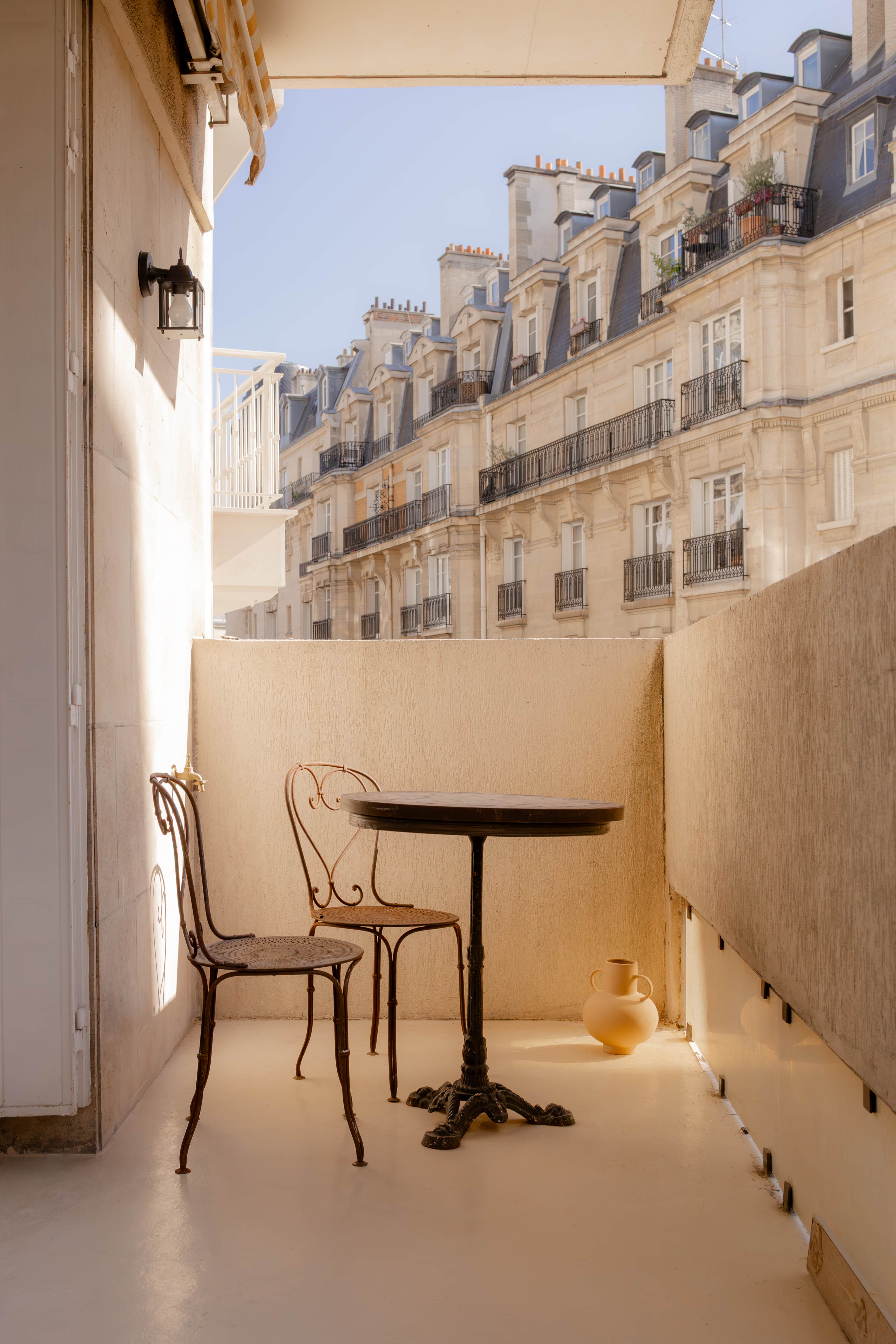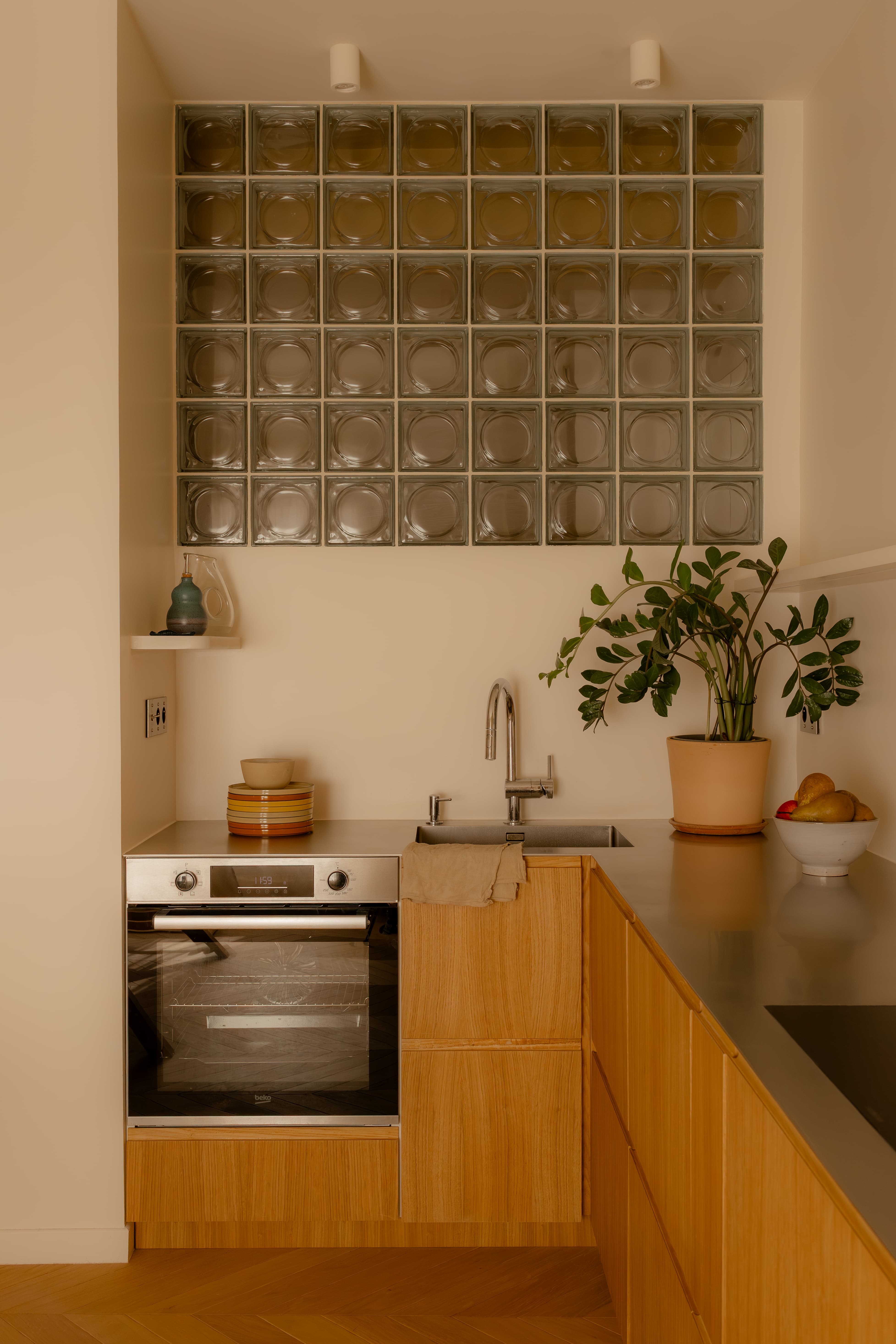 La buanderie reculée derrière la cuisine dégage les circulations et libère de la surface utile. Une fenêtre sur cour apporte une présence végétale rare dans un appartement parisien.